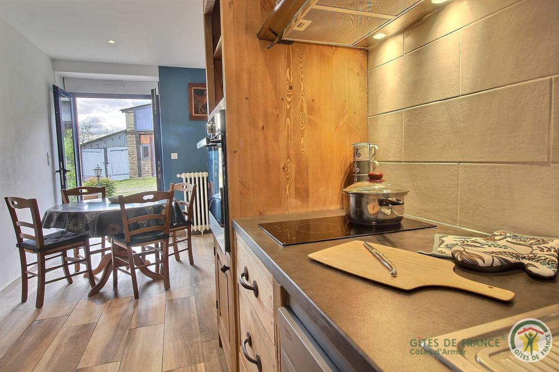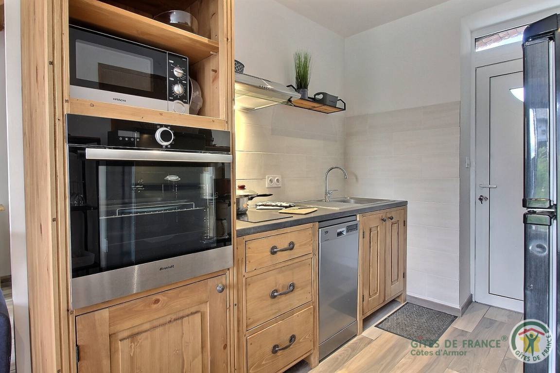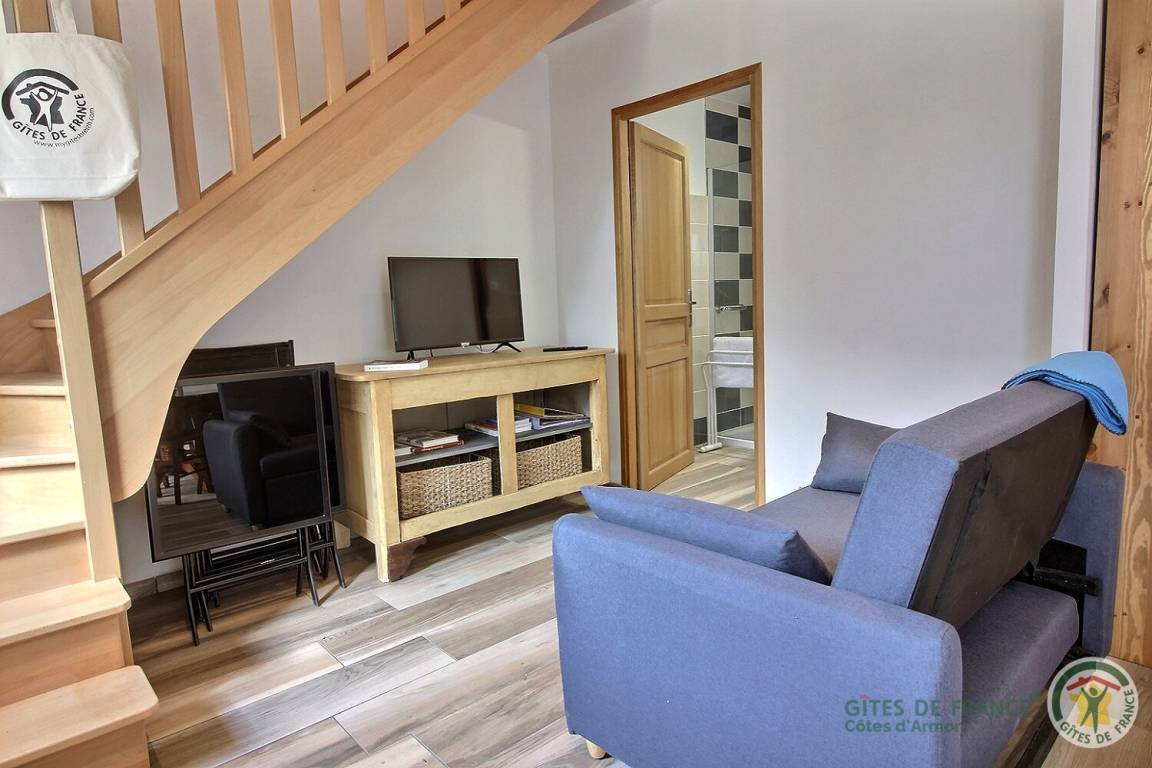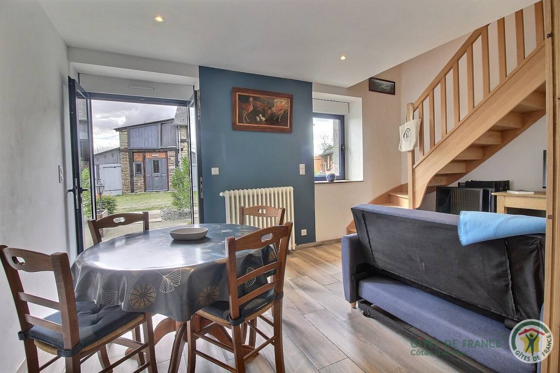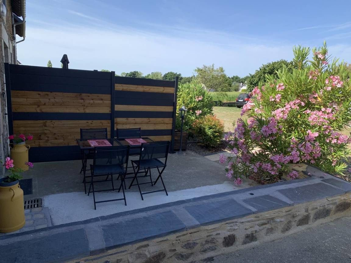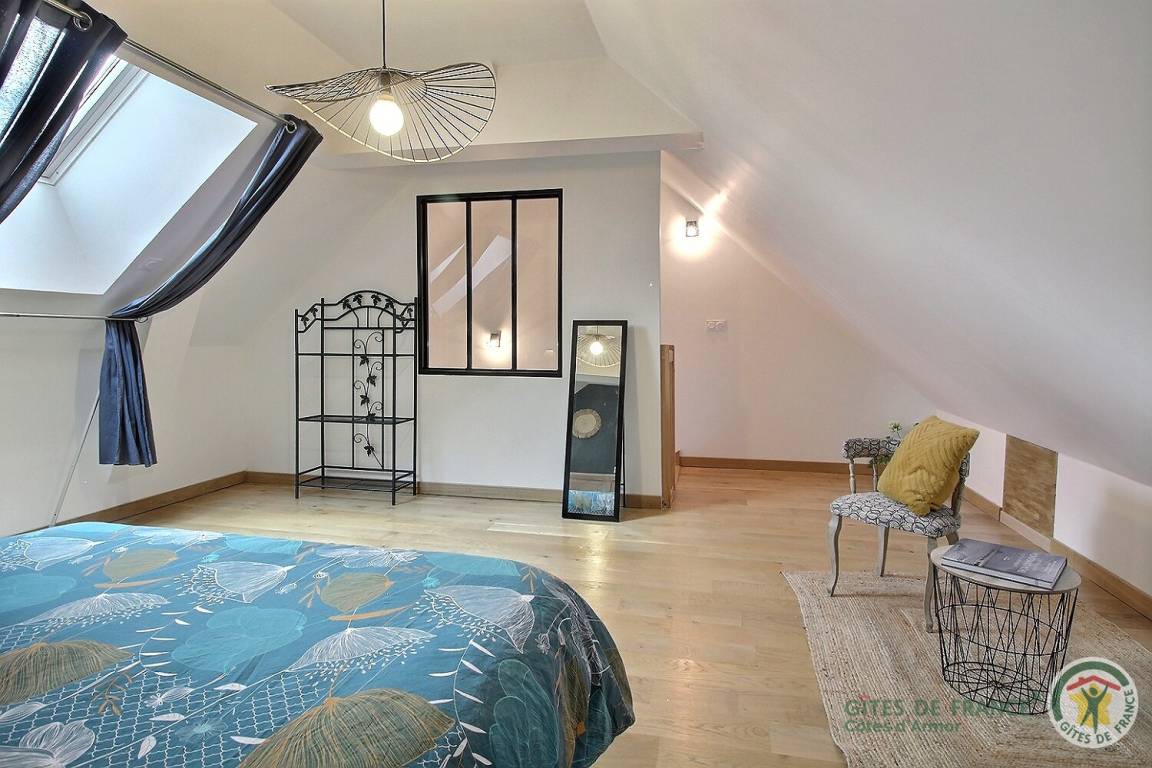 Ihre Ferienwohnung umfasst im Erdgeschoss: ein Wohnzimmer mit Küchenbereich, ein Badezimmer (mit Dusche, Waschbecken, Toilette und Waschmaschine). Obergeschoss: ein Schlafzimmer im Zwischengeschoss mit einem Doppelbett 160x200 (kann auf vorherige Anfrage in 2x80x200 geteilt werden). Auf der Landseite: eine private 15 m² große Terrasse, die gerade fertiggestellt wird, ein Innenhof, der von kleinen renovierten Nebengebäuden umgeben ist, ein mit den Eigentümern geteilter Garten mit Blick auf die Felder. Straßenseite: ein privater geschotterter Parkplatz. Gîte neben dem Haus der Besitzer.