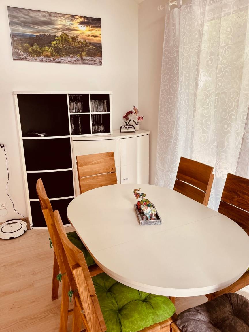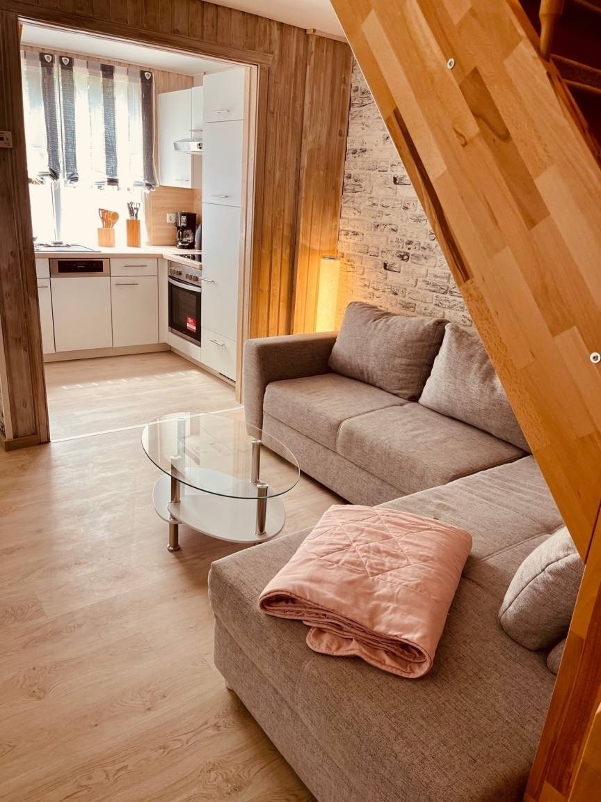 Der lichtdurchflutete Wohnraum überzeugt mit einer bequemen Sitzlandschaft, einem Essplatz für 5 Personen, großem Smart-TV und einem Kaminofen für gemütliche Abende. Die Sitzlandschaft kann zusätzlich als Schlafgelegenheit genutzt werden.