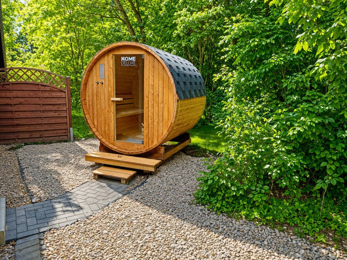 Ein besonderes Highlight ist Ihre eigene Fasssauna im Garten – jederzeit nutzbar für wohltuende Wellnessmomente nach einem aktiven Tag.