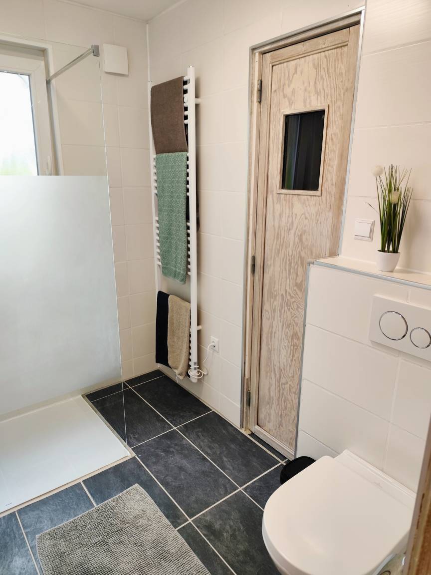 Ein echtes Highlight ist Ihre private Sauna mit direktem Zugang vom Badezimmer – jederzeit nutzbar für Ihre persönliche Wellness-Auszeit.