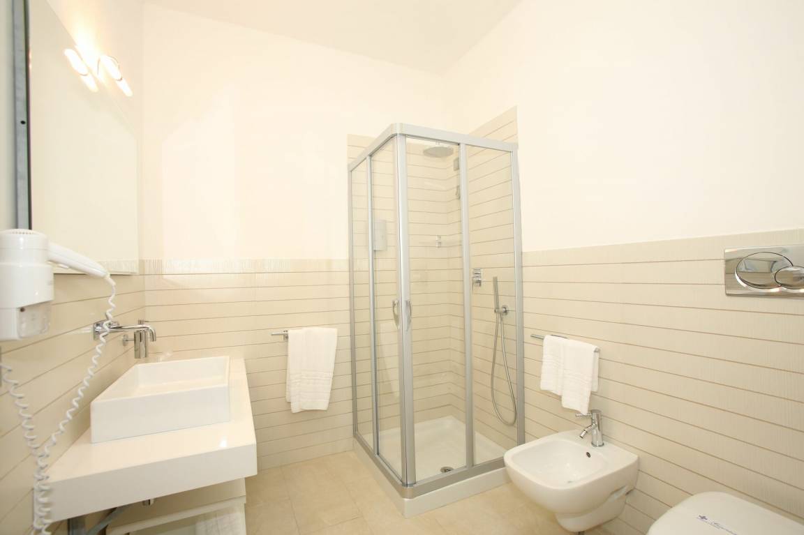 Badezimmer: Waschbecken, WC, Bidet, Dusche.