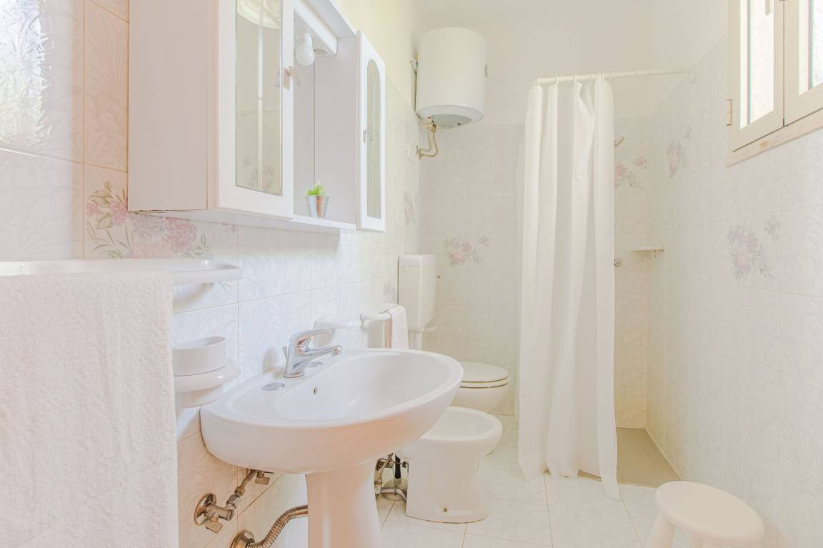 Badezimmer: Waschbecken, WC, Bidet, Dusche, Fön.