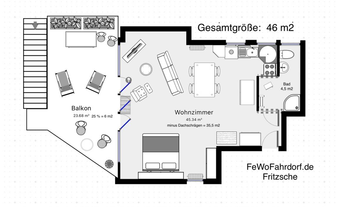 46 m² Ferienwohnung ∙ 1 Schlafzimmer ∙ 3 Gäste
