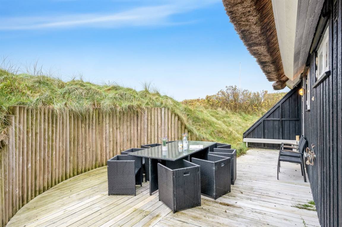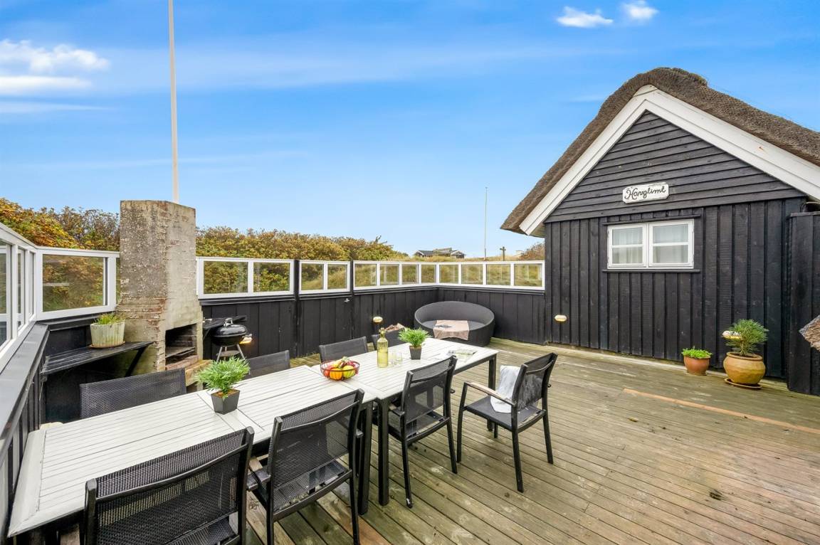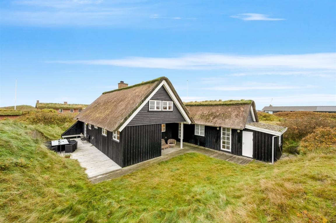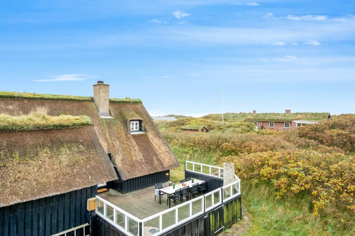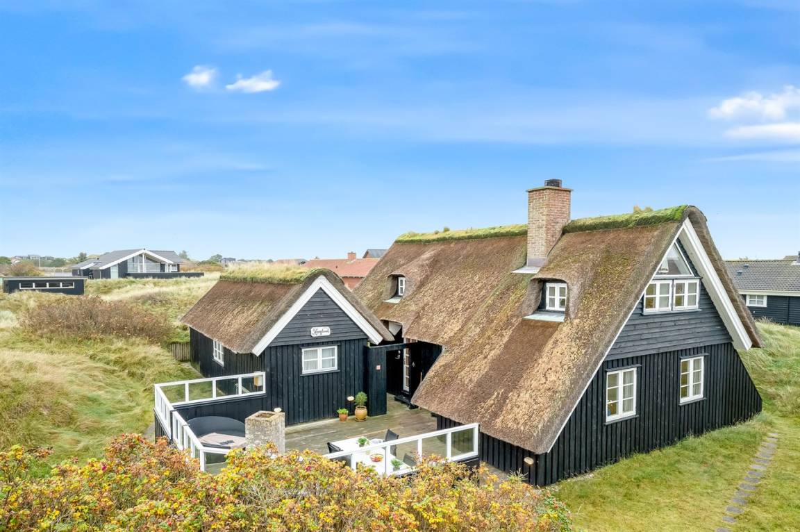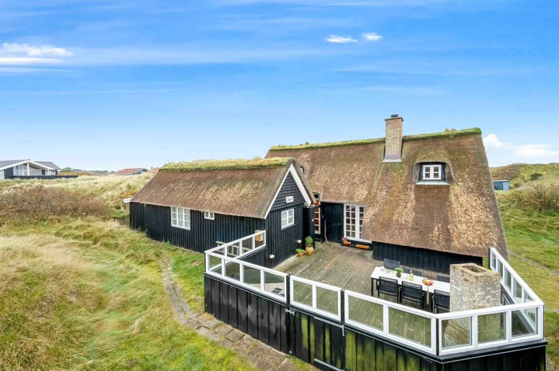 Dicht am Strand liegt dieses reetgedeckte und sehr geräumige Ferienhaus auf einem leicht hügeligen Dünengrundstück. Auf der großen Terrassenfläche, die das Haus umgibt, können Sie den ganzen Tag hindurch die Sonne genießen. Das Haus ist persönlich und geschmackvoll eingerichtet und eignet sich ganz vorzüglich für eine Familie mit Kindern. Zu dem Zeitpunkt, wo das Ferienhaus gebaut wurde, konnte man das Meer vom Wohnzimmer aus sehen. Das Dünengebiet und die Dünen auf Fanø sind jedoch unter konstater Wandlung und verändern sich Jahr für Jahr. Die Dünen vor dem Haus verhindern daher den Meeresblick vom Wohnzimmer im Erdgeschoss – vom Fernsehzimmer im Obergeschoss ist das Meer jedoch weiterhin zu ahnen. Beim Haus gibt es zwei Parkplätze.