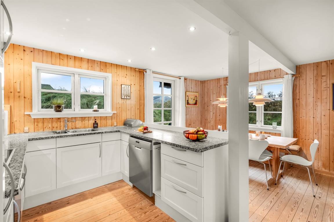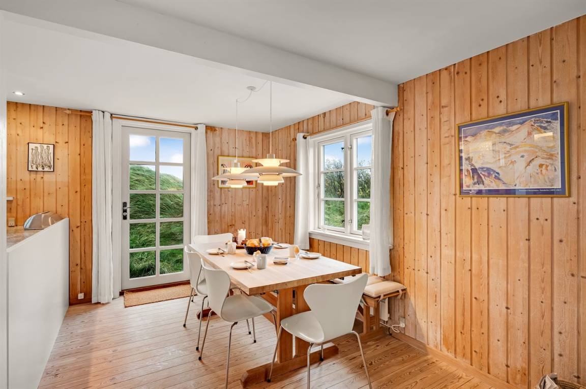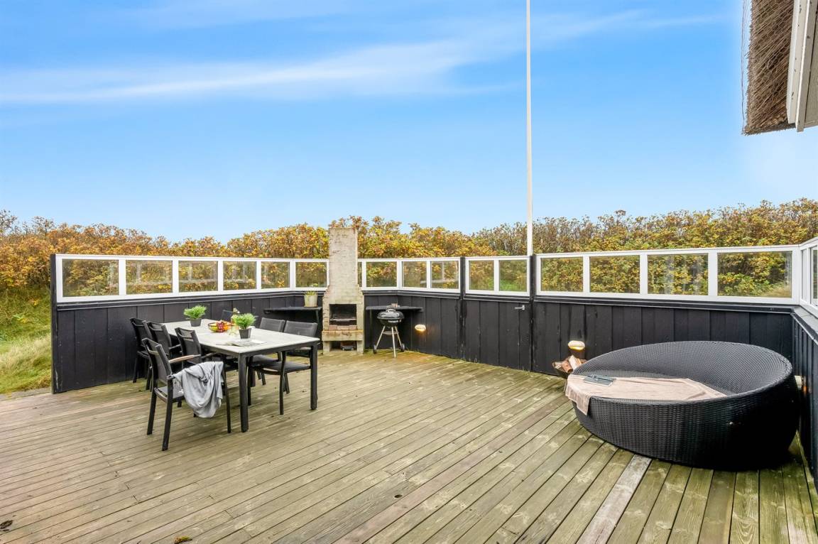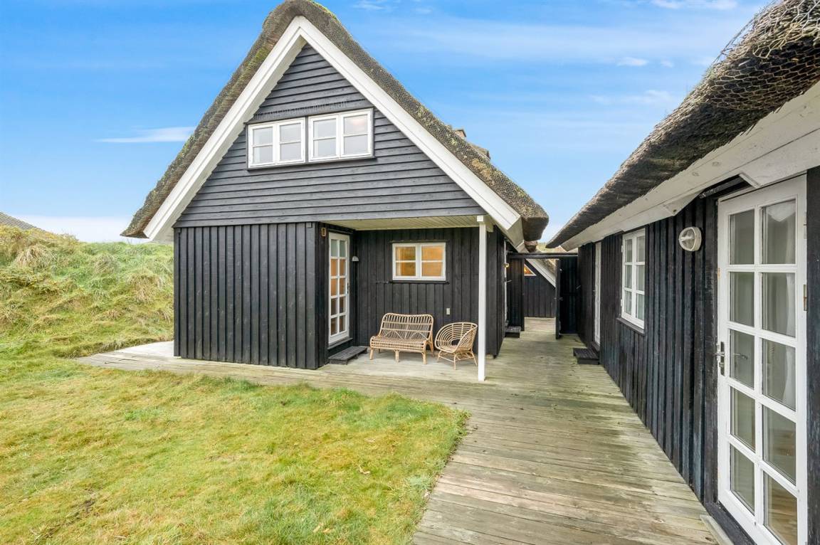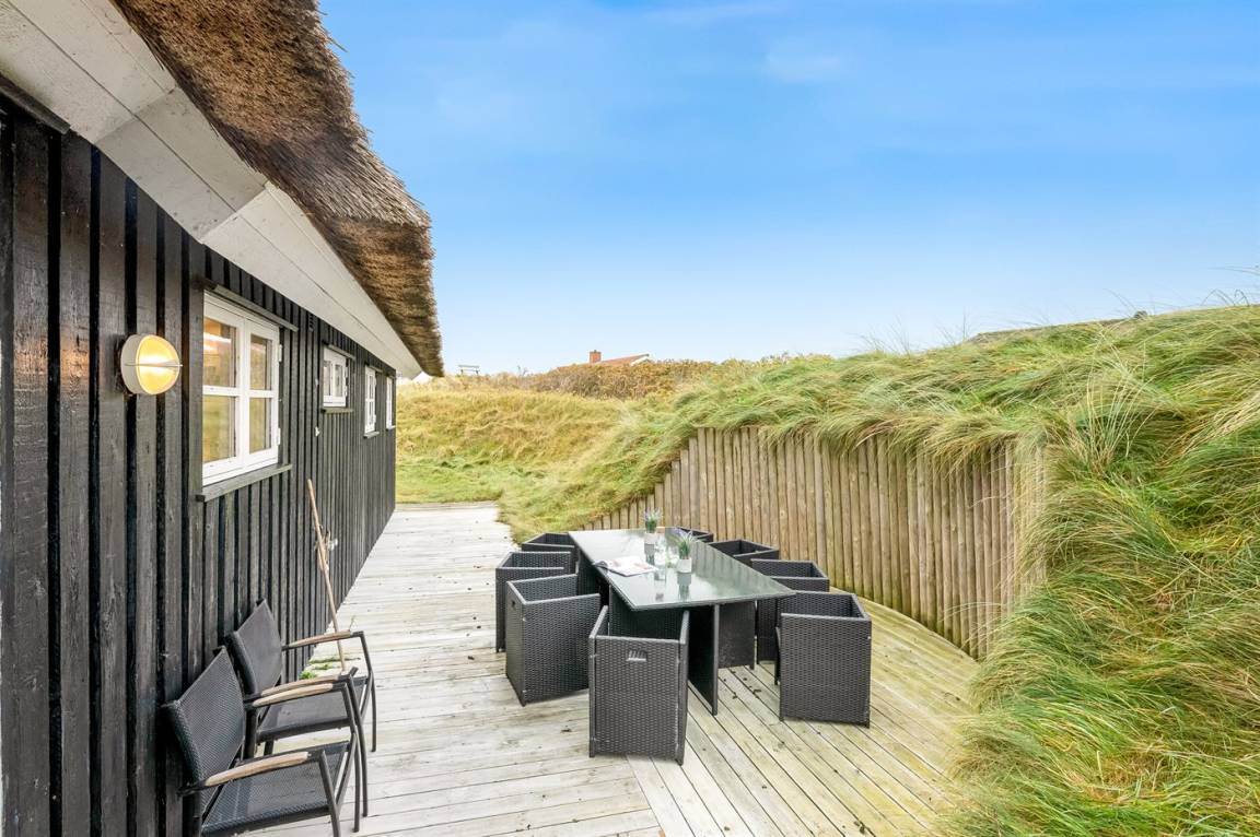 Dicht am Strand liegt dieses reetgedeckte und sehr geräumige Ferienhaus auf einem leicht hügeligen Dünengrundstück. Auf der großen Terrassenfläche, die das Haus umgibt, können Sie den ganzen Tag hindurch die Sonne genießen. Das Haus ist persönlich und geschmackvoll eingerichtet und eignet sich ganz vorzüglich für eine Familie mit Kindern. Zu dem Zeitpunkt, wo das Ferienhaus gebaut wurde, konnte man das Meer vom Wohnzimmer aus sehen. Das Dünengebiet und die Dünen auf Fanø sind jedoch unter konstater Wandlung und verändern sich Jahr für Jahr. Die Dünen vor dem Haus verhindern daher den Meeresblick vom Wohnzimmer im Erdgeschoss – vom Fernsehzimmer im Obergeschoss ist das Meer jedoch weiterhin zu ahnen. Beim Haus gibt es zwei Parkplätze.