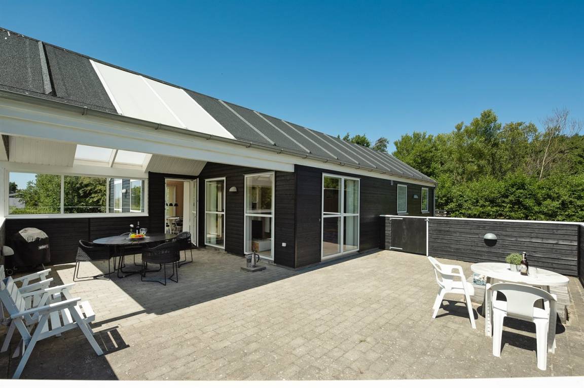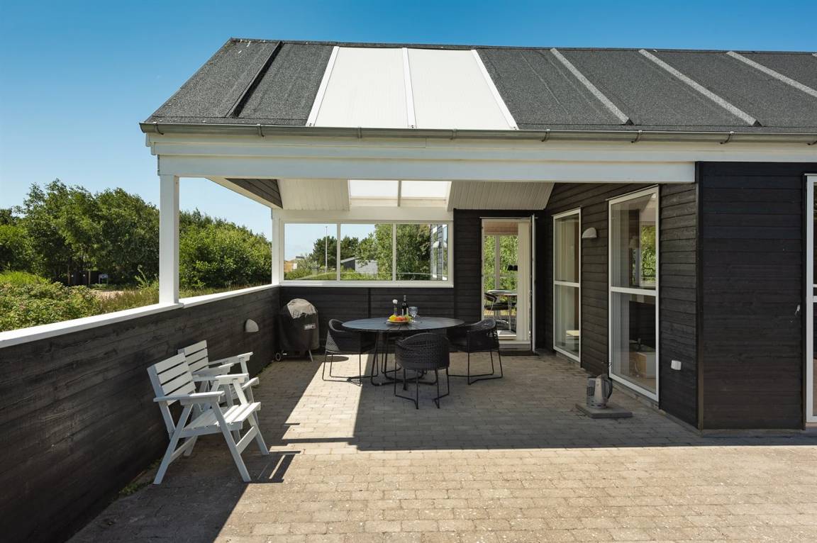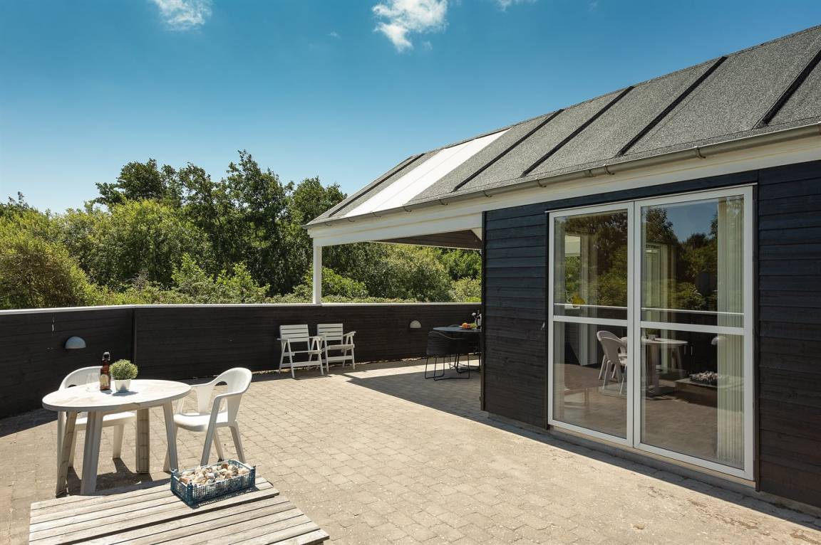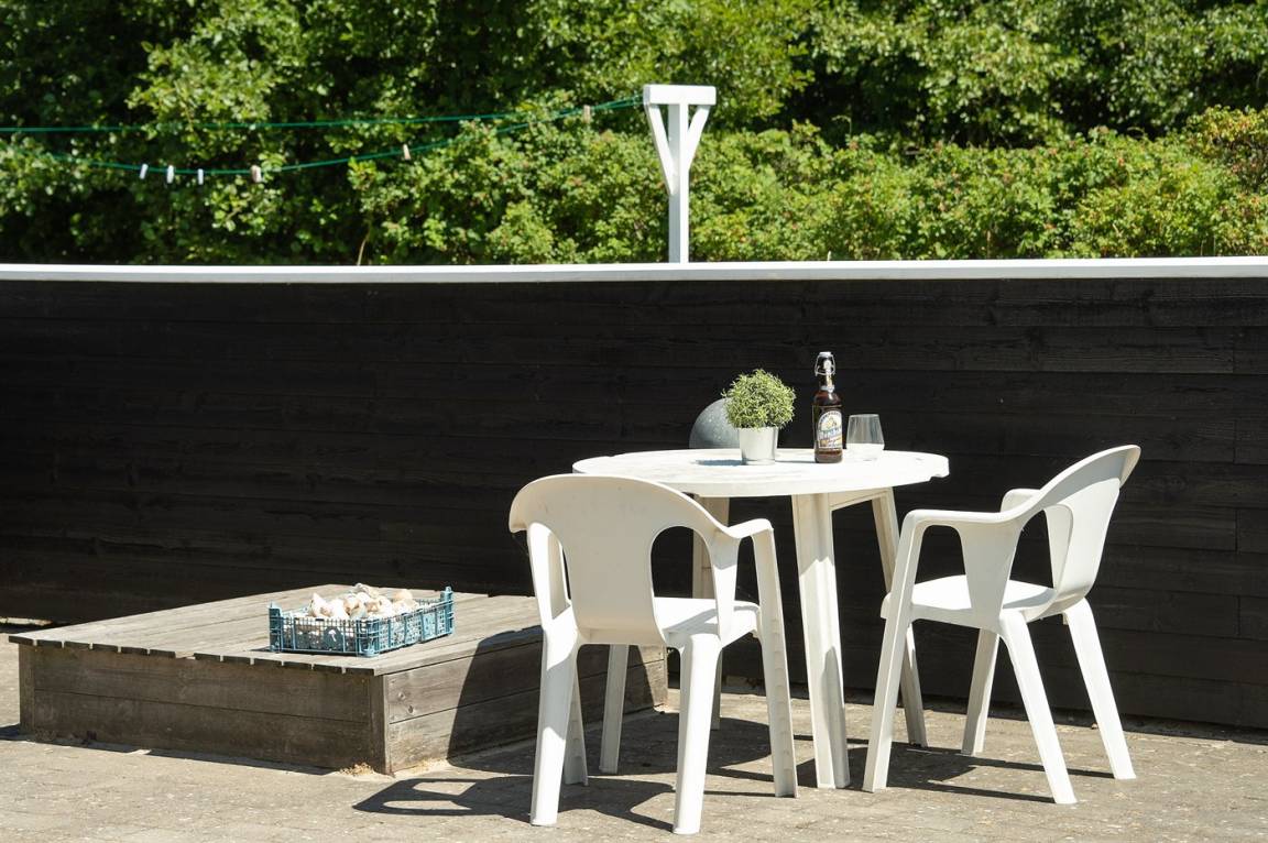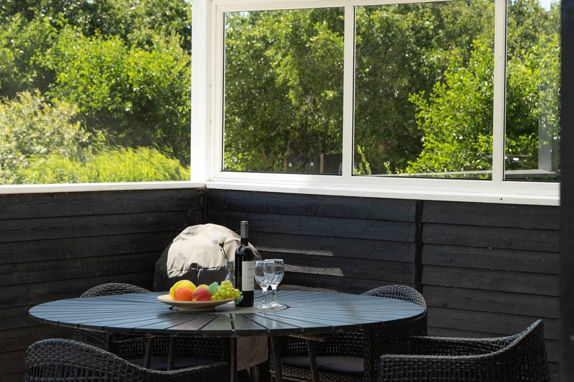 Dieses schöne Ferienhaus ist aus guten Materialien gebaut und mit Sinn fürs Detail eingerichtet. Zum Haus gehört eine schöne, geschlossene Terrasse mit Gartenmöbeln – hier kann man es sich den Sommer hindurch gemütlich machen. Übrigens: Die 2 Schlafplätze auf Matratzen befinden sich in einem offenen Obergeschoss - in dem einen Schlafzimmer.
