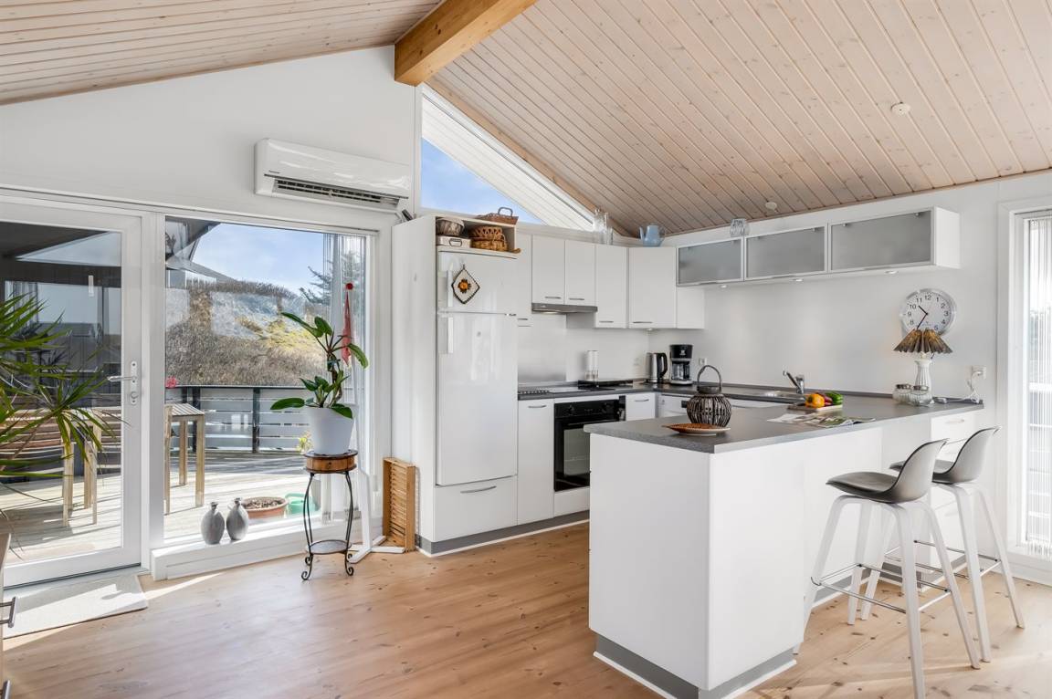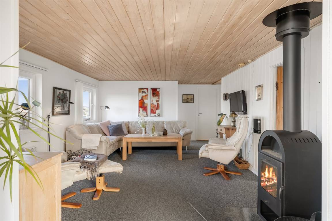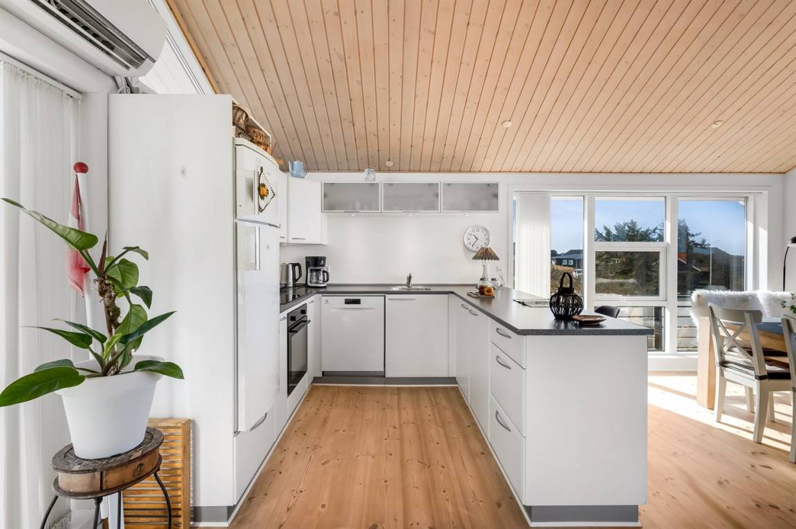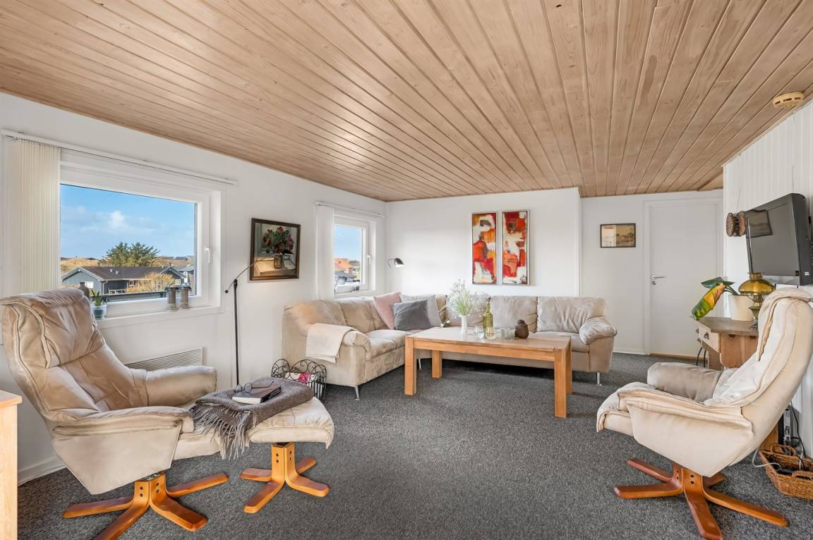 Hoch auf einer Düne gelegen und mit schöner Aussicht auf das Gebiet, liegt dieses persönliche und gepflegte Haus. 2009 wurde eine Essecke und eine Küche angebaut. Der Anbau hat schräge Wände und große Fenster. Gemütliche Wohnstube mit Brennofen. 2009 ist auch ein neues Badezimmer mit Waschmaschine hinzugekommen. 3 gute Schlafzimmer mit Einzel-und Doppelbetten. Es gibt mehrere Ausfahrten auf die große Terrasse, die das ganze Haus umgibt. Ein Haus, wo Sie auf jeden Fall wiederkommen.