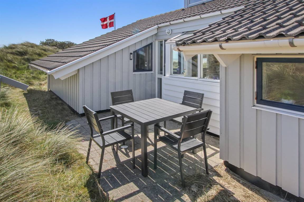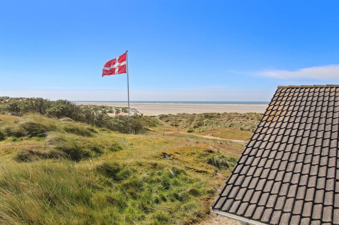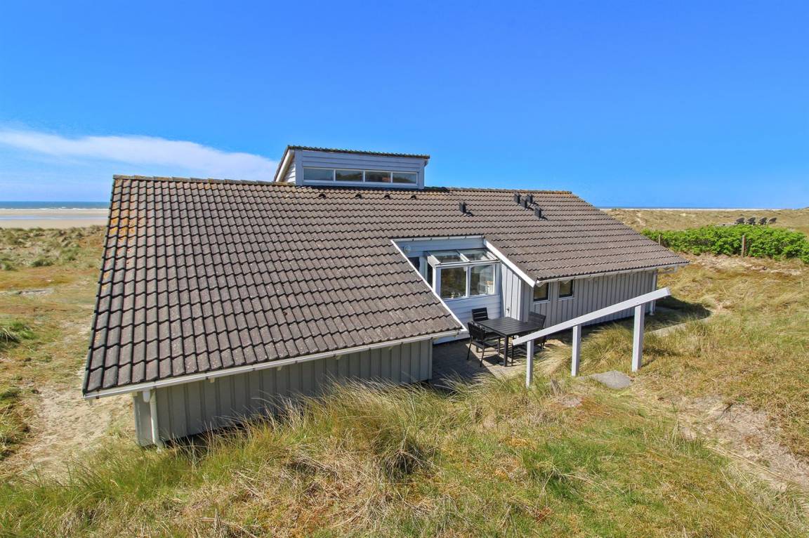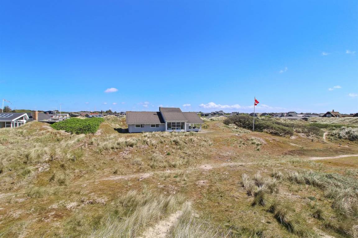 In erster Dünenreihe liegt dieses gepflegte und gemütliche Ferienhaus – in einer der besten Lagen Fanøs. Sowohl vom sehr großen, hügeligen Grundstück als auch von Terrasse und Wohnzimmer aus haben Sie Ausblick aufs Meer.