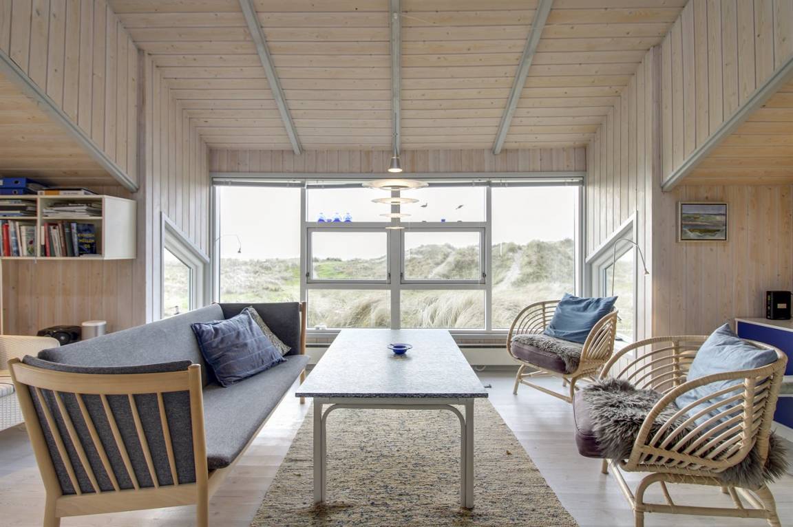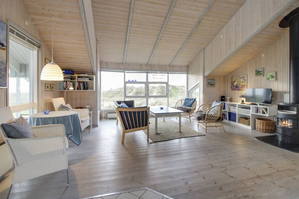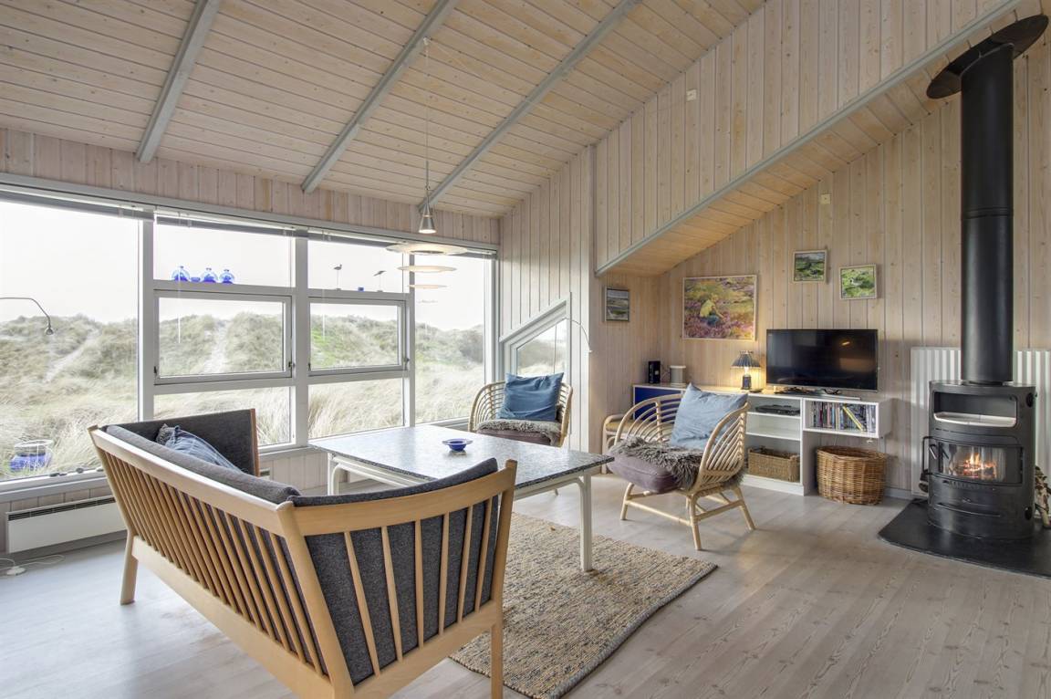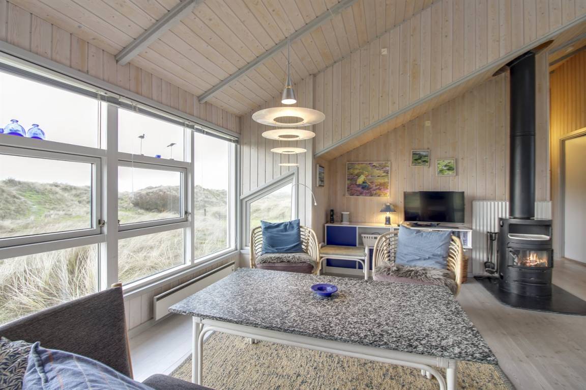 In erster Dünenreihe liegt dieses gepflegte und gemütliche Ferienhaus – in einer der besten Lagen Fanøs. Sowohl vom sehr großen, hügeligen Grundstück als auch von Terrasse und Wohnzimmer aus haben Sie Ausblick aufs Meer.