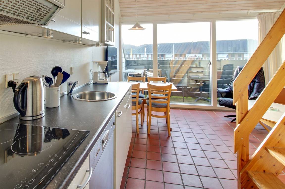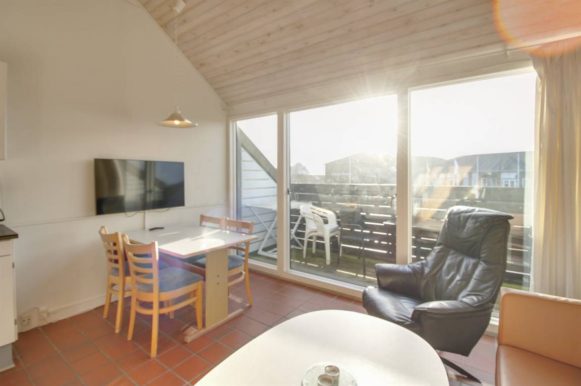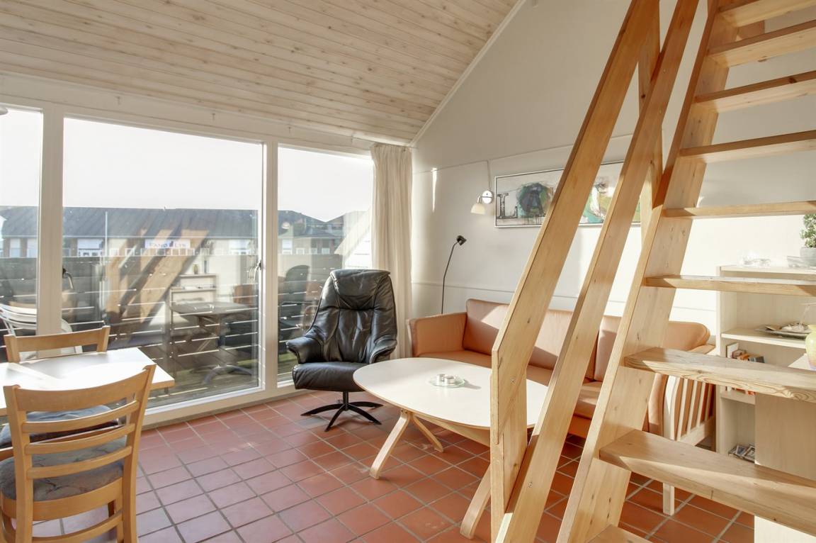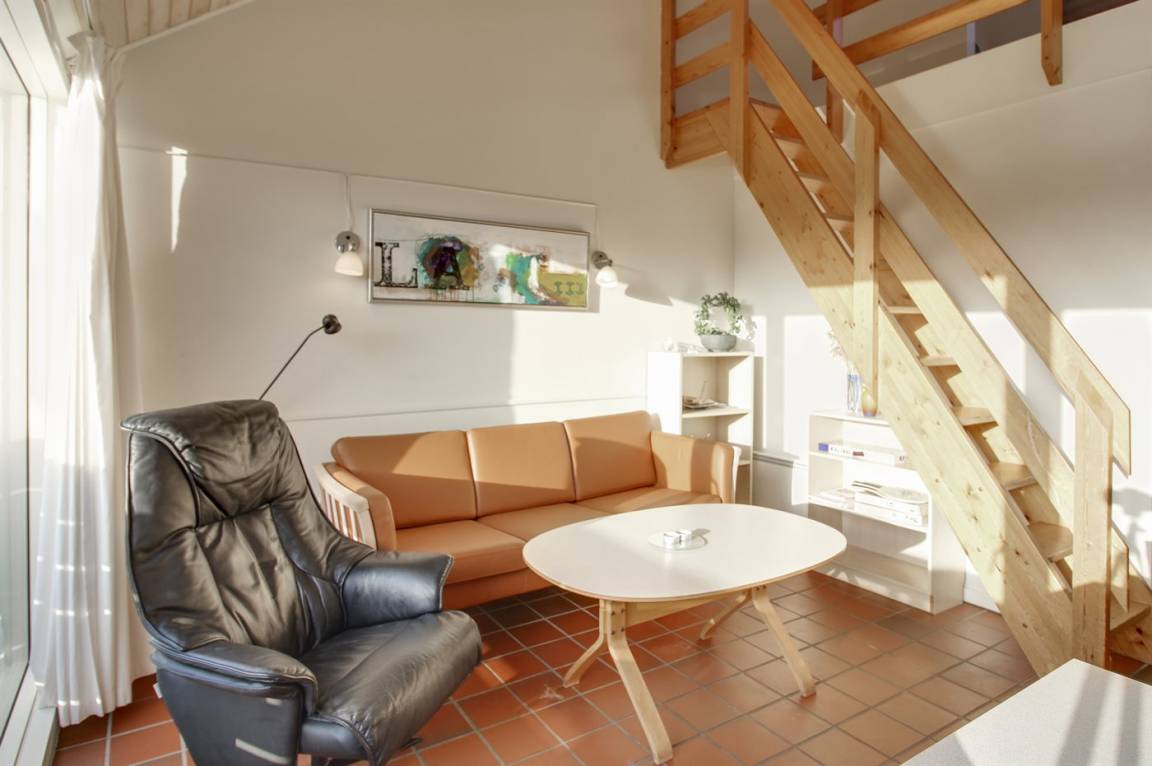 Wohnung im ersten Stock. Zentral gelegen nahe an der Nordsee und in der Nähe von Golf, Tennis und Restaurants. Übrigens: Treppe zum offenes Obergeschoss med Doppelbett, und im Wohnzimmer befindet sich Doppelschlafcouch.