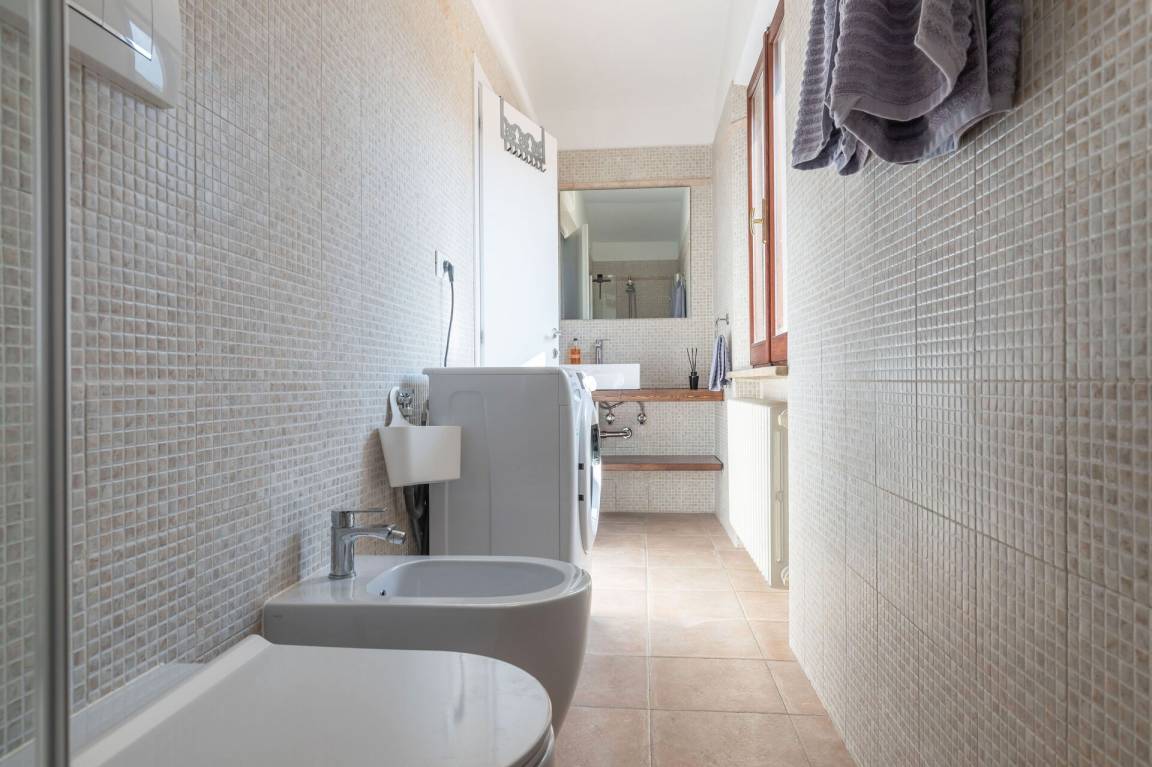 Badezimmer: Waschbecken, WC, Bidet, Dusche, Fön.