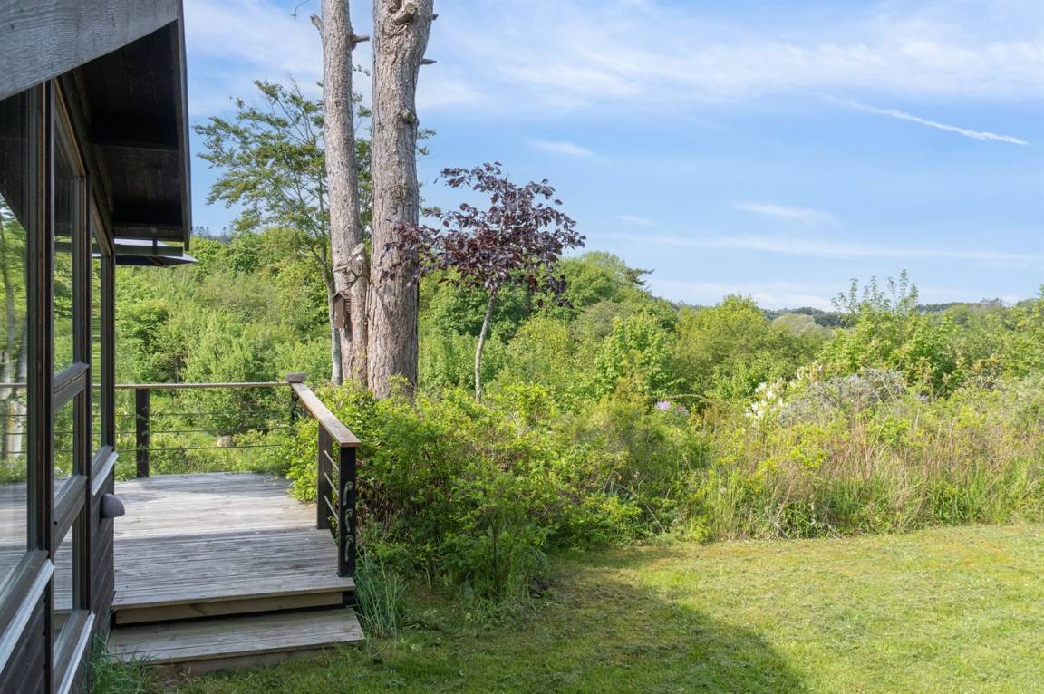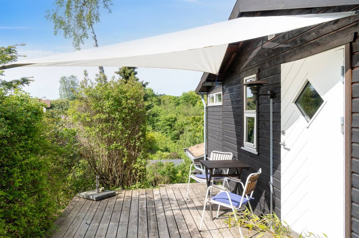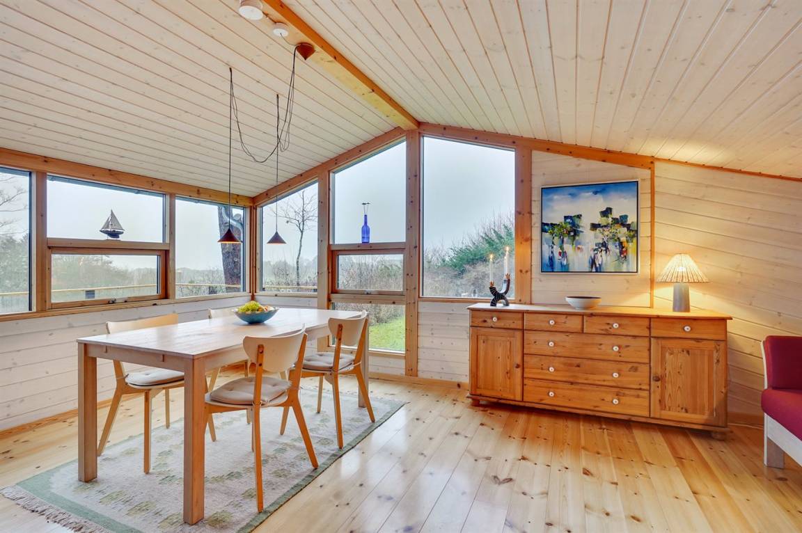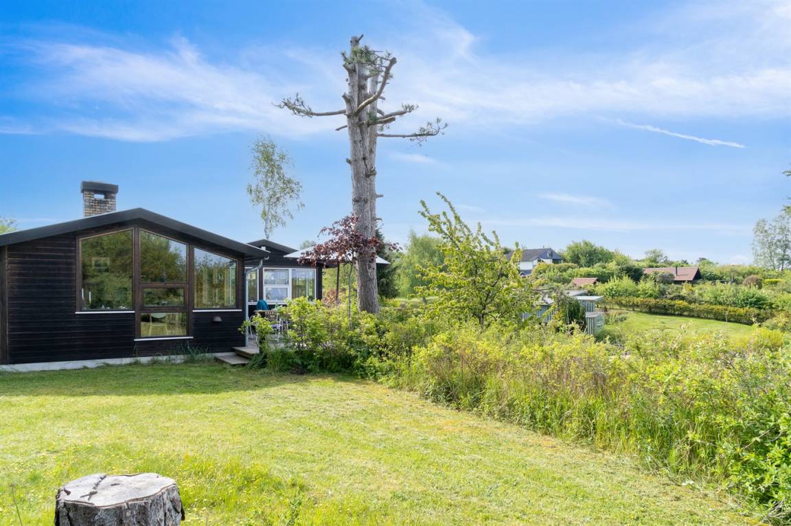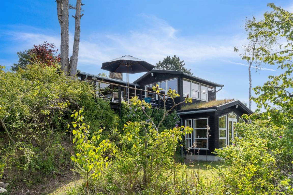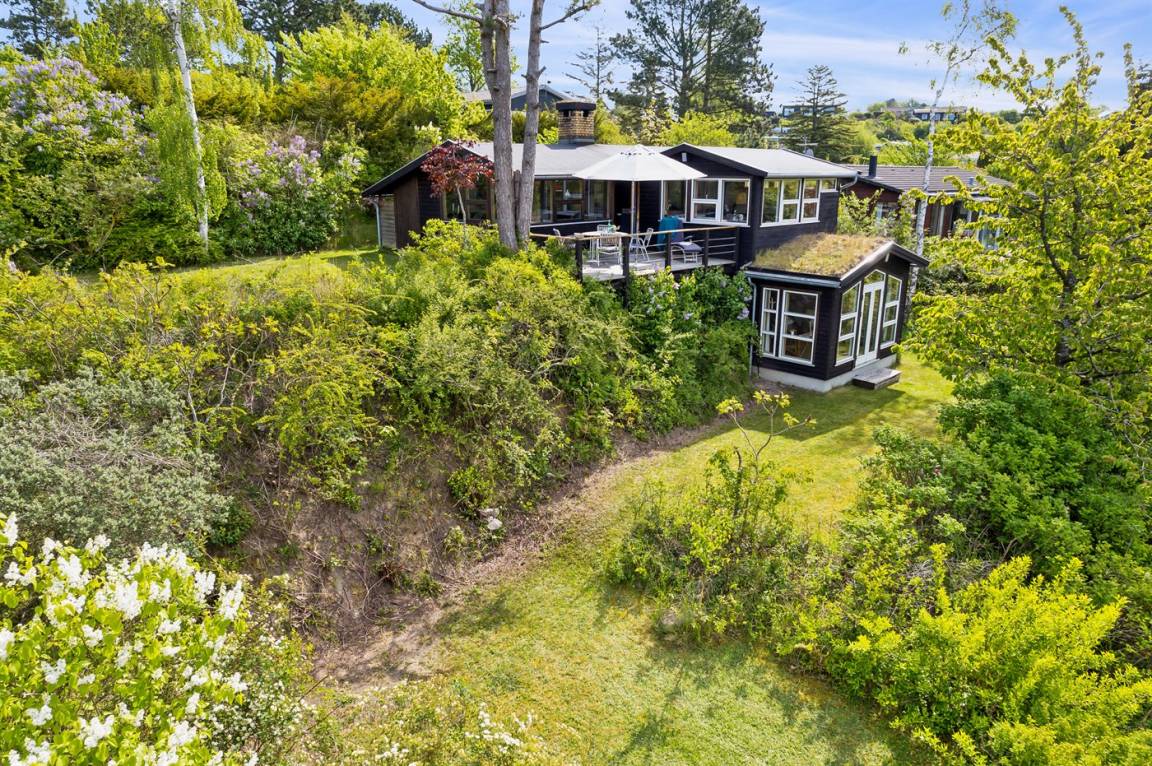 Ein sehr interessantes und ungestört gelegenes Ferienhaus mit Meerblick. Das Haus liegt am Ende einer Sackgasse in einer Gegend zwischen Vejrhøj und Ordrup Næs mit malerischen Moränenhügeln aus er letzten Eiszeit. Von Haus und Terrasse blicken Sie über die Hügel auf Wald und Meer.