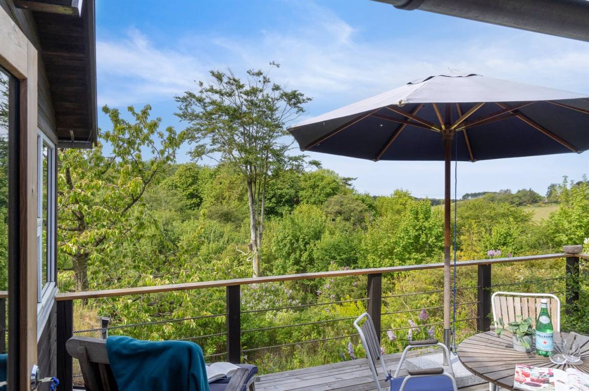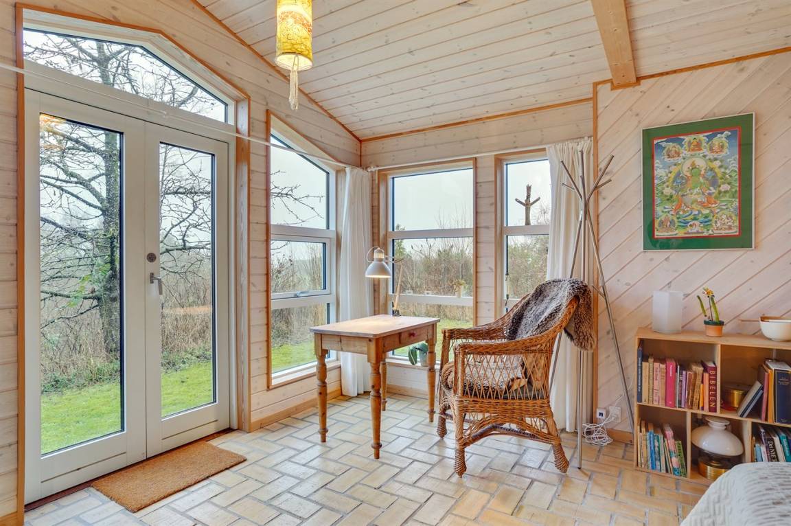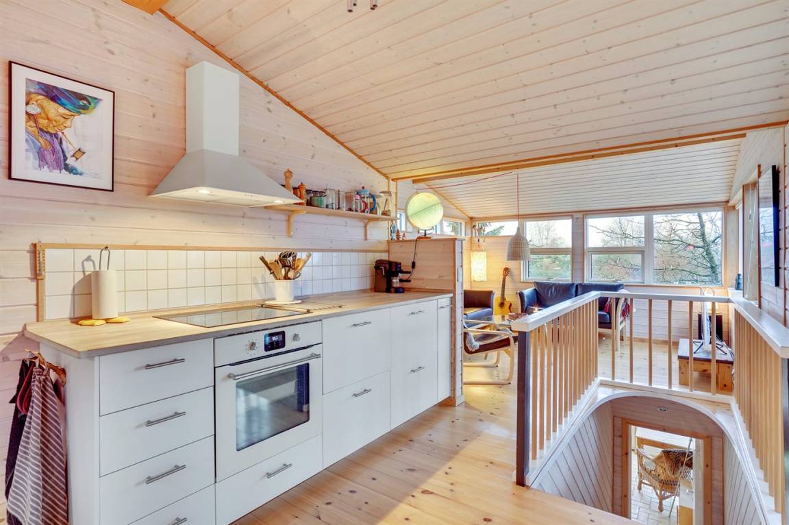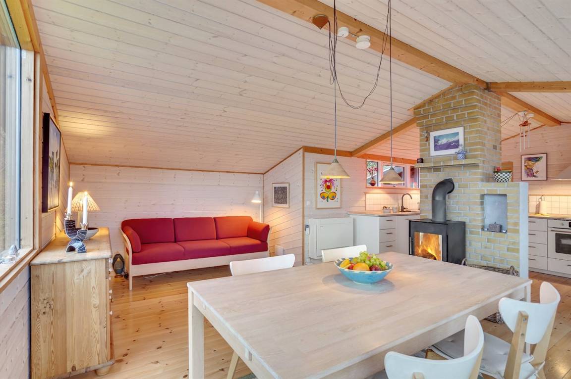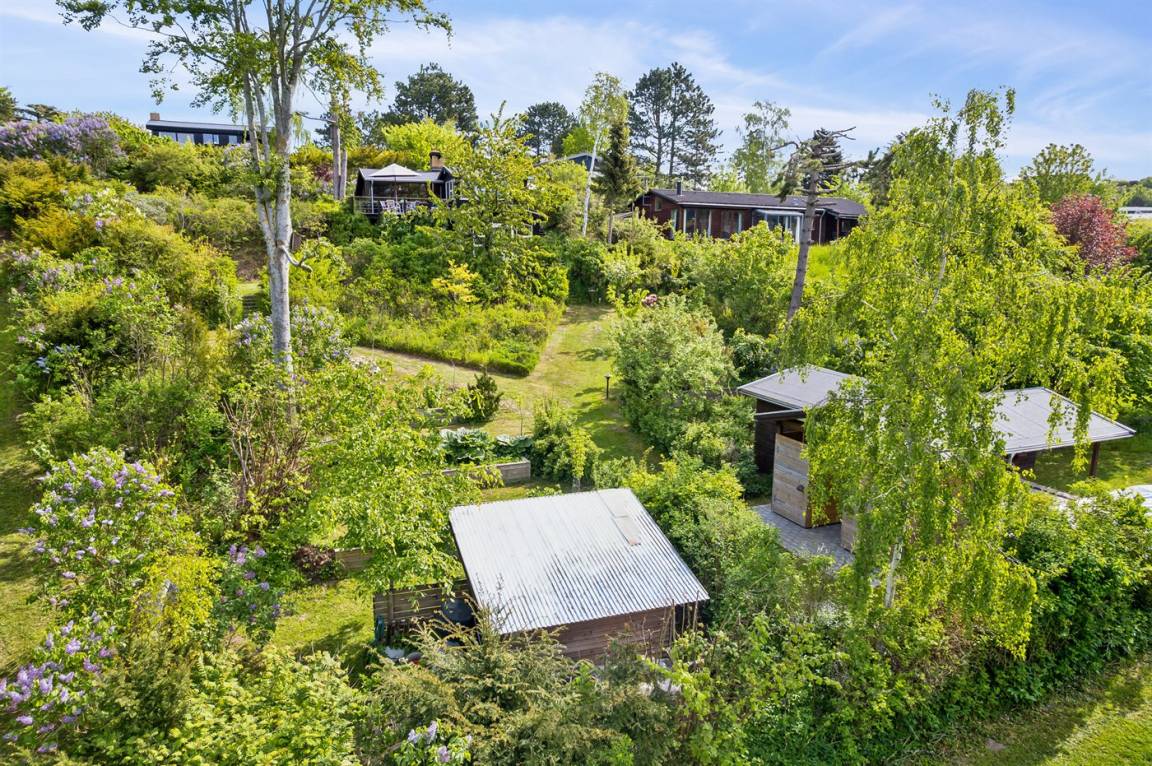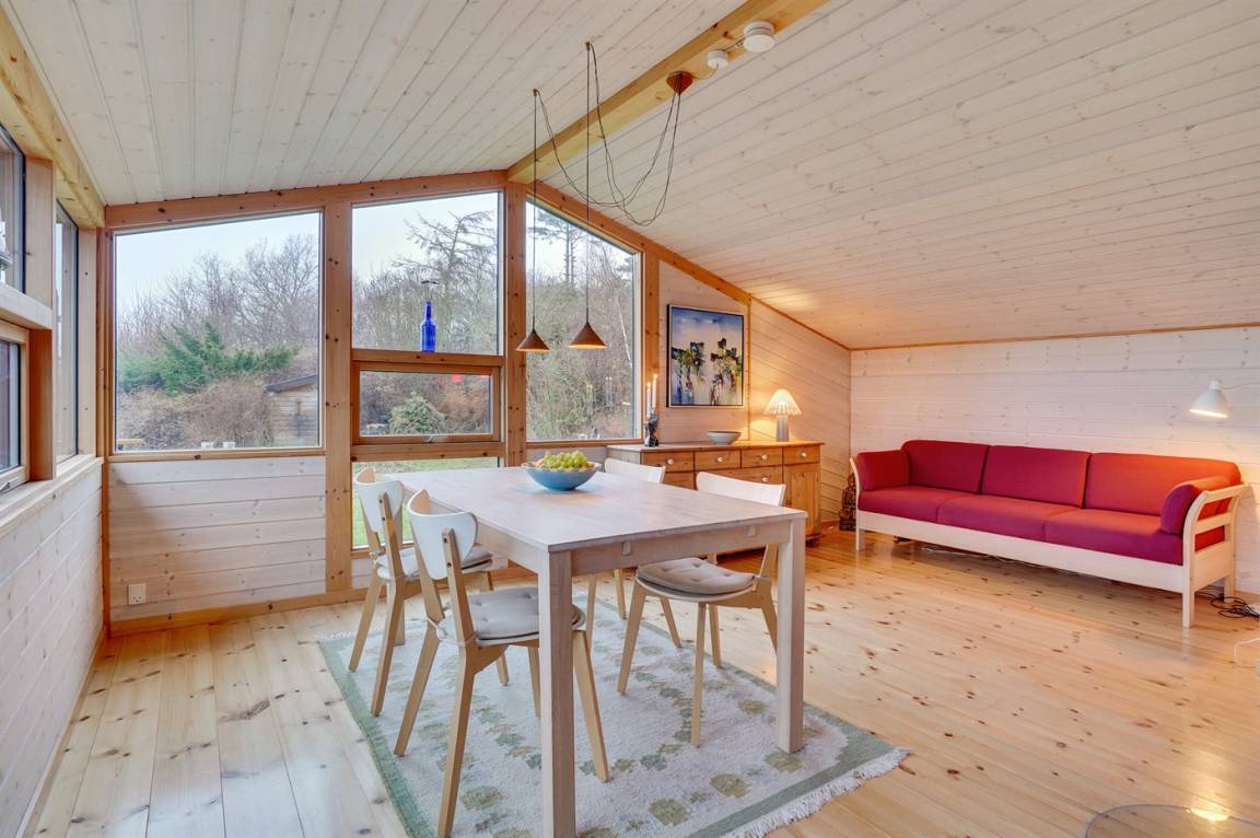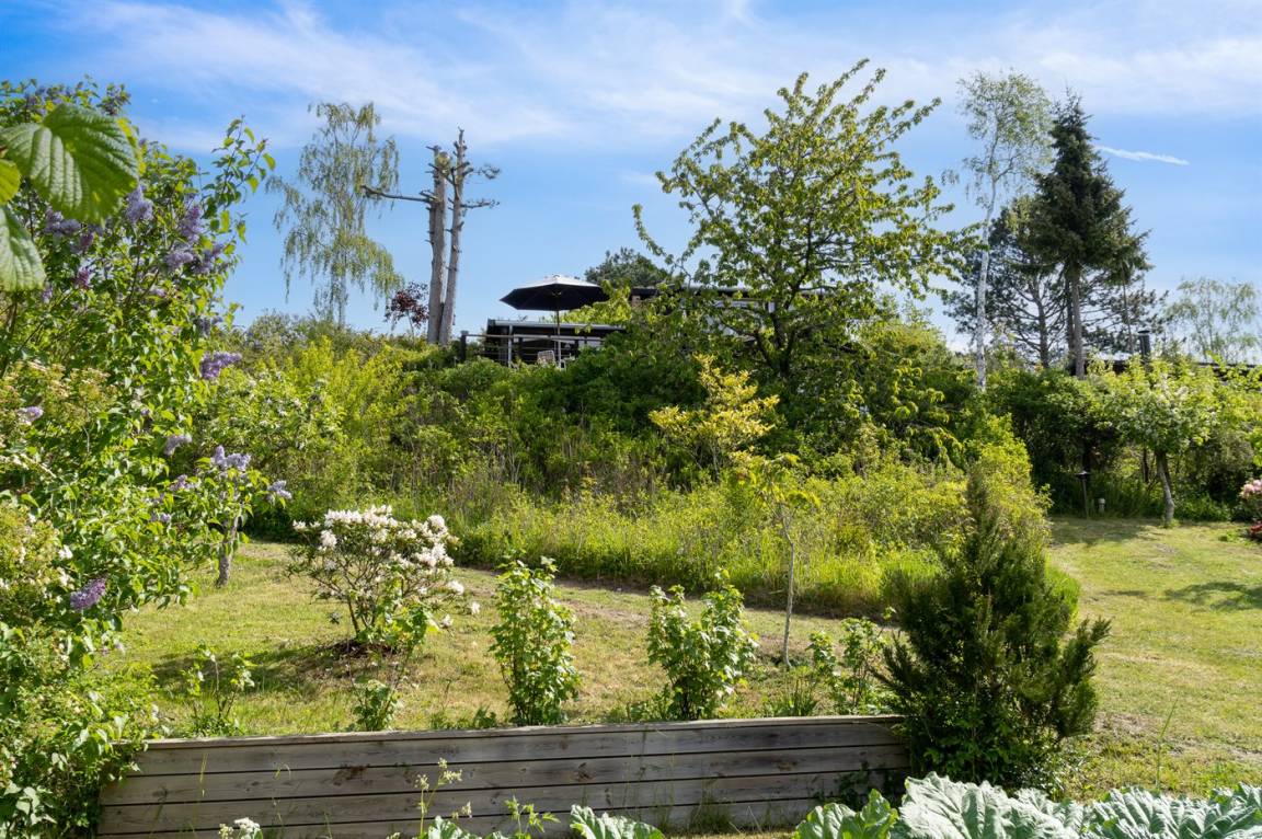 Ein sehr interessantes und ungestört gelegenes Ferienhaus mit Meerblick. Das Haus liegt am Ende einer Sackgasse in einer Gegend zwischen Vejrhøj und Ordrup Næs mit malerischen Moränenhügeln aus er letzten Eiszeit. Von Haus und Terrasse blicken Sie über die Hügel auf Wald und Meer.