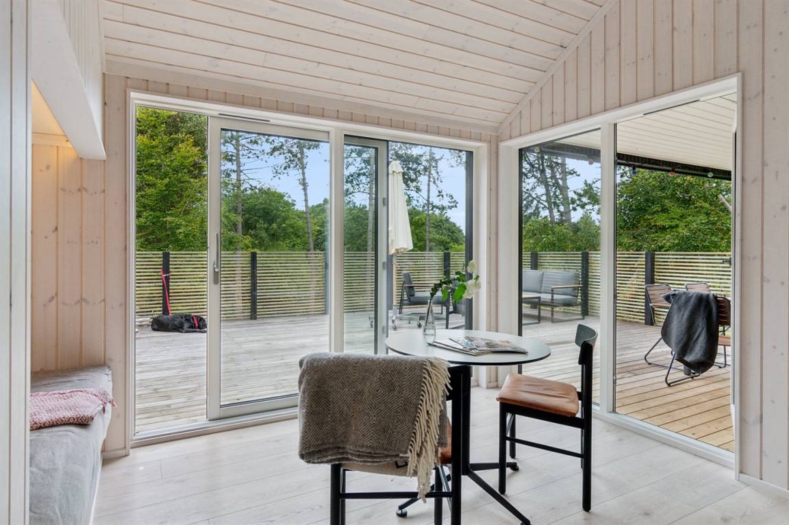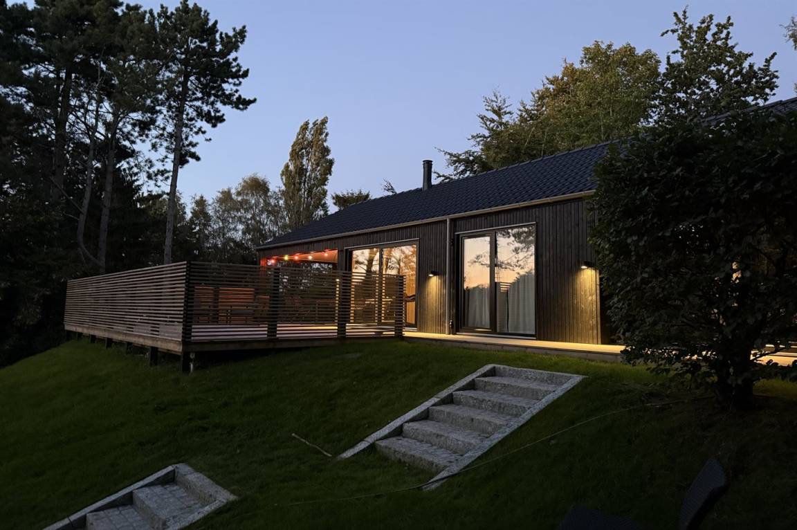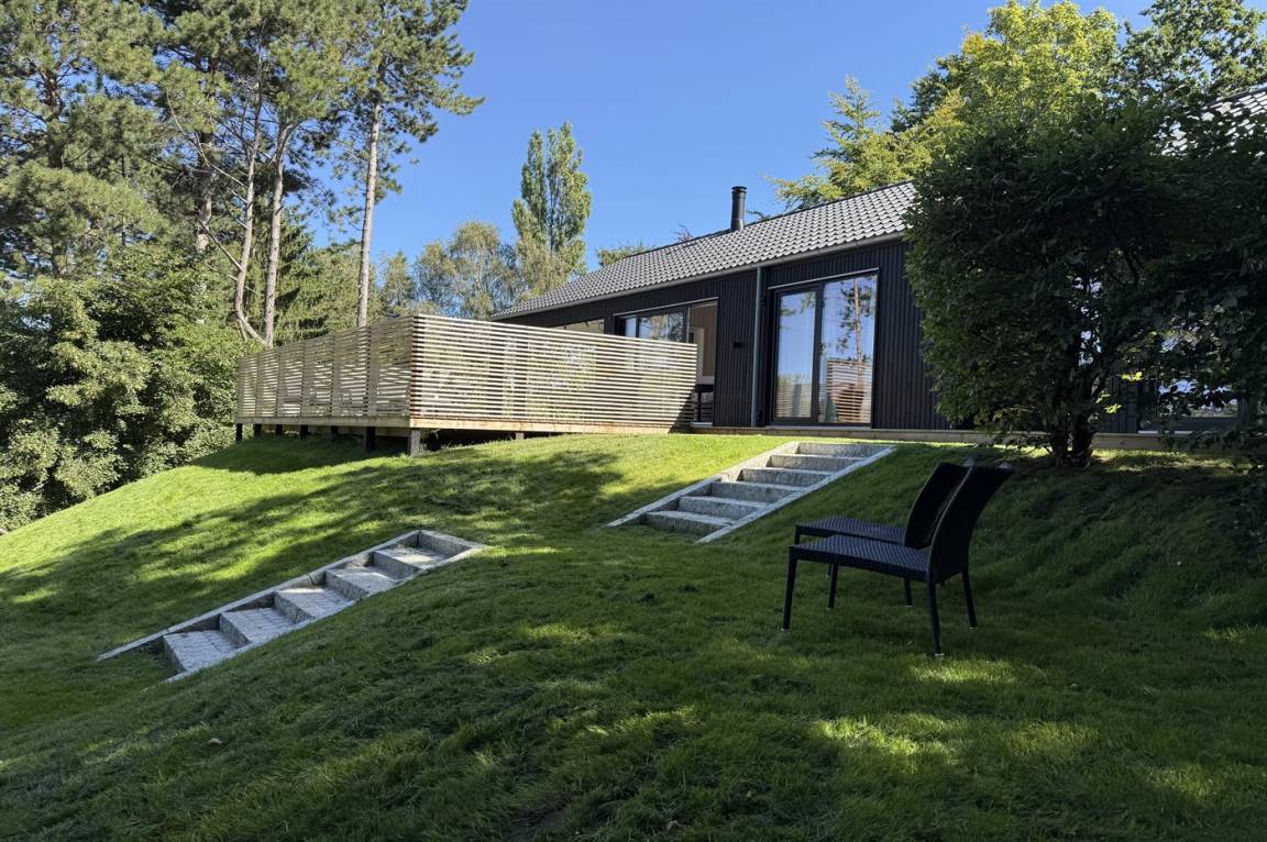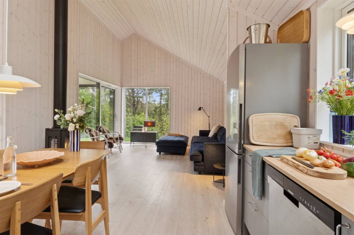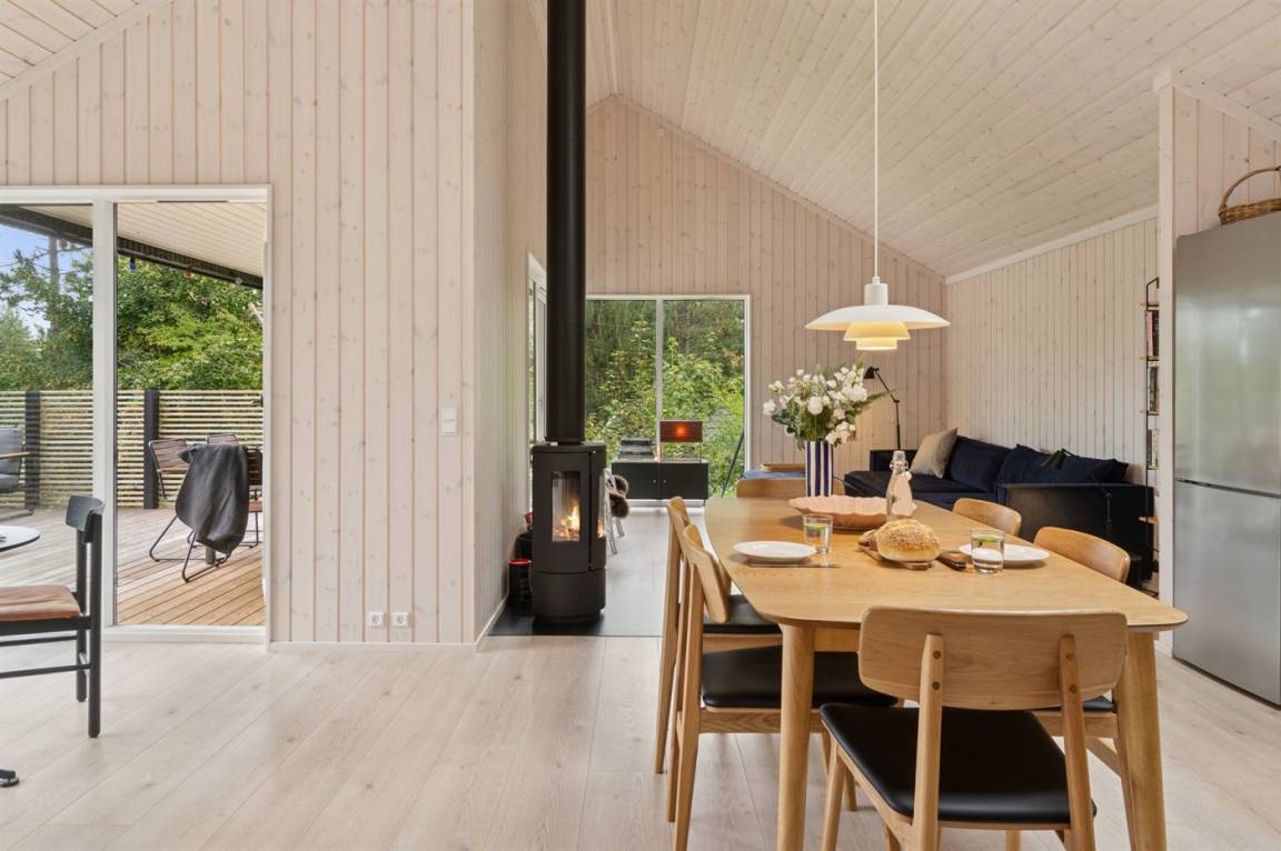 Neues, traumhaftes Ferienhaus (Baujahr 2024) im beliebten Ordrup – in Strand- und Waldnähe. Dieses fantastische, neu erbaute Ferienhaus liegt zentral im begehrten Ordrup, nur wenige Gehminuten vom Strand und Wald entfernt. Das Haus liegt auf einem ruhigen, ungestörten Grundstück in erhöhter Lage mit Blick in die Baumwipfel – sowohl vom Haus als auch von der großen Terrasse. Restaurants, Eisdiele und Einkaufsmöglichkeiten (saisonabhängig geöffnet) in nur 100 m Entfernung. Zur kinderfreundlichen, flach abfallenden Ordrup Strand mit langer Bade- und Bootsbrücke sind es lediglich 850 m.
