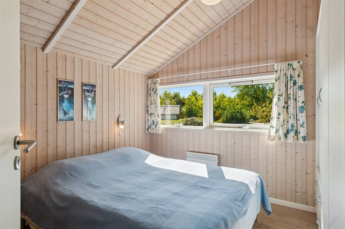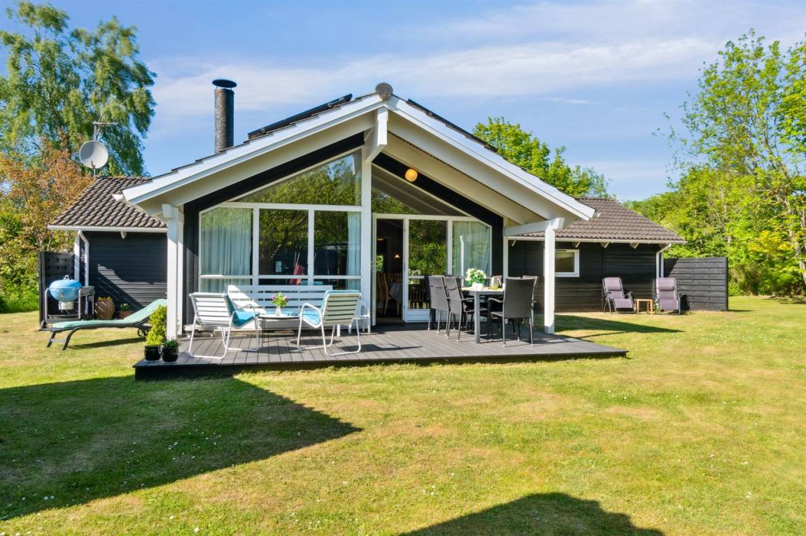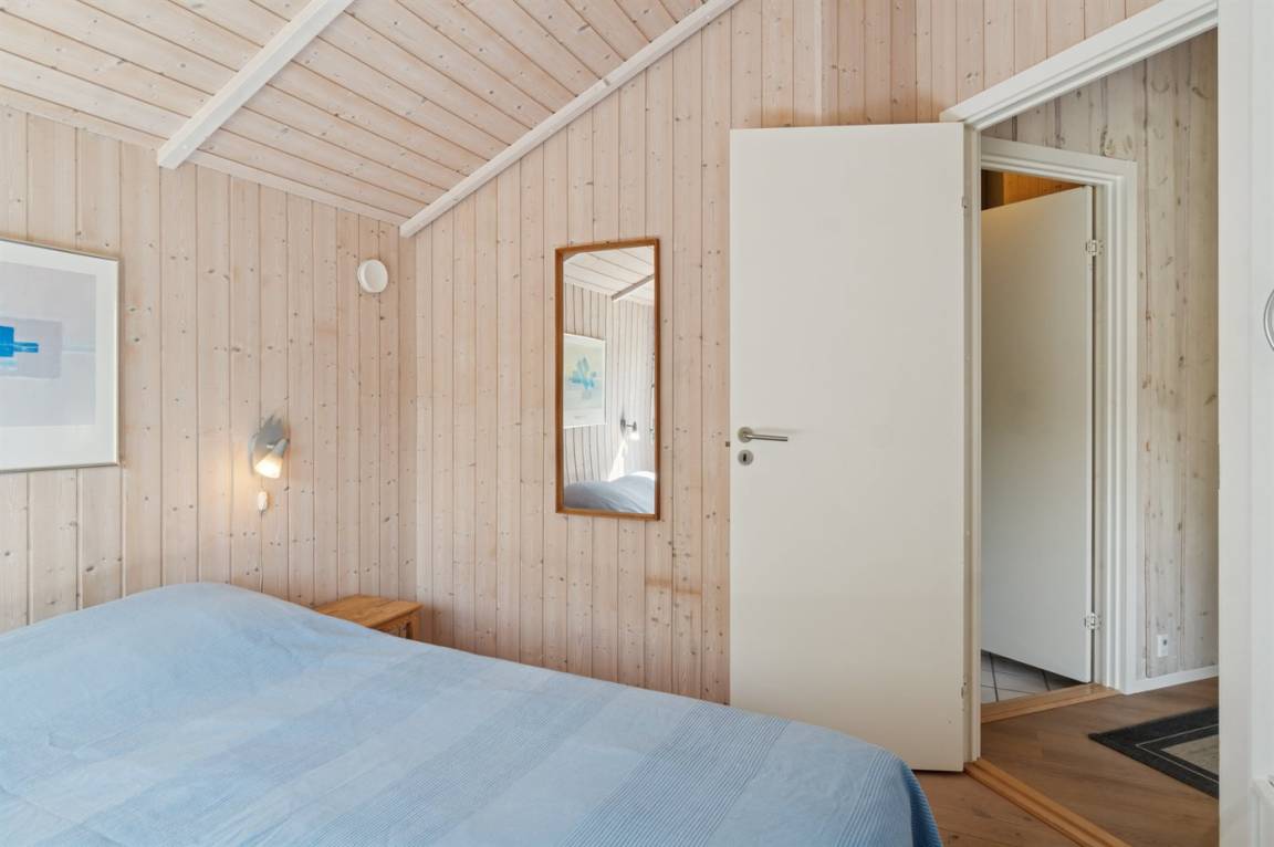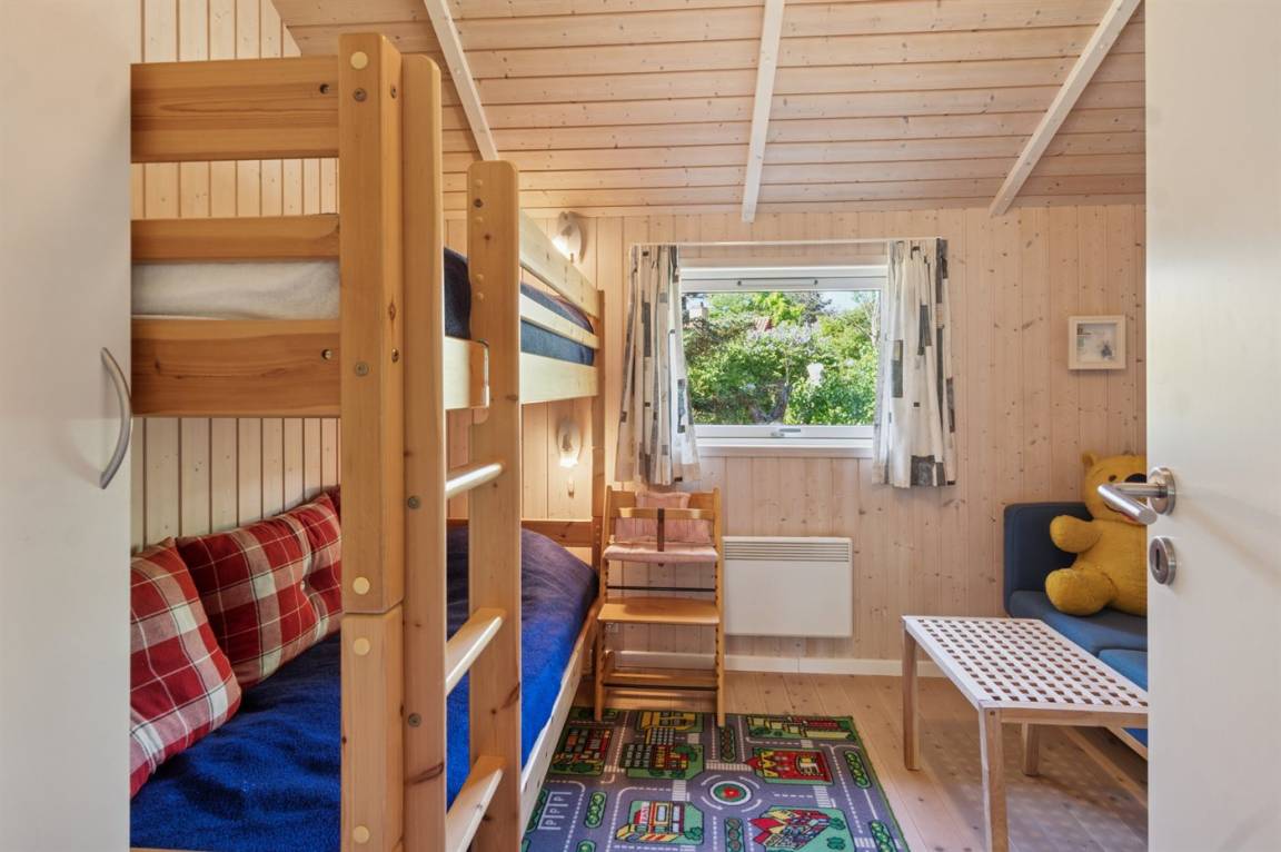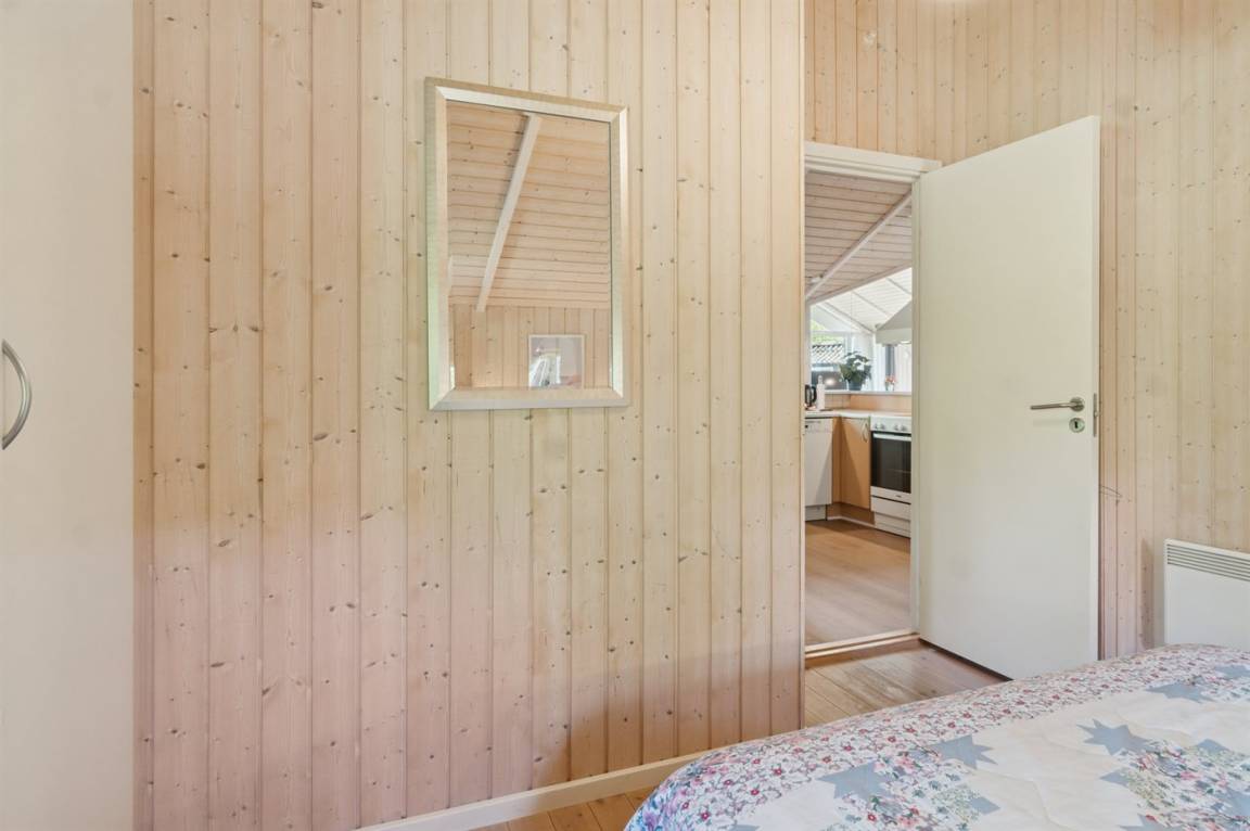 Auf einem Naturgrundstück nur 250 m vom Badestrand entfernt liegt dieses schöne Ferienhaus aus Holz mit Whirlpool und Sauna, 2002 gebaut. Zum Haus gehört sowohl offene als auch überdachte Terrasse mit Gartenmöbeln. Innen gibt es Holzböden. Das Haus ist mit 2 Badezimmern mit Dusche eingerichtet. Das eine ist ferner mit Fußbodenheizung, 3-Pers. Whirlpool und Zutritt zur Sauna des Hauses ausgestattet. Moderne Küche in offener Verbindung mit dem Wohnzimmer mit u. a. Geschirrspüler, Mikrowelle, Tiefkühlgerät und Herd mit Ceran-Feld. Das helle Wohnzimmer enthält Kaminofen, TV, Chromecast, DVD-Spieler sowie Stereoanlage mit CD-Spieler. Es können keine Fernsehsender empfangen werden - nur Streaming. Die 8 Schlafplätze verteilen sich auf 4 Schlafzimmer; 3 mit Doppelbett und 1 mit Etagenbett. Zusätzliches TV mit eingebautem DVD-Spieler in dem einen Schlafzimmer. An weiterer Ausstattung können kostenlose, kabellose Internetverbindung (Computer ist mitzubringen), Waschmaschine sowie Wäschetrockner erwähnt werden und es ist eine energiesparende Wärmepumpe installiert. Für die kleinen Feriengäste stehen Kinderbett, Kinderhochstuhl, Schaukel, Rutsche und Sandkasten bereit.