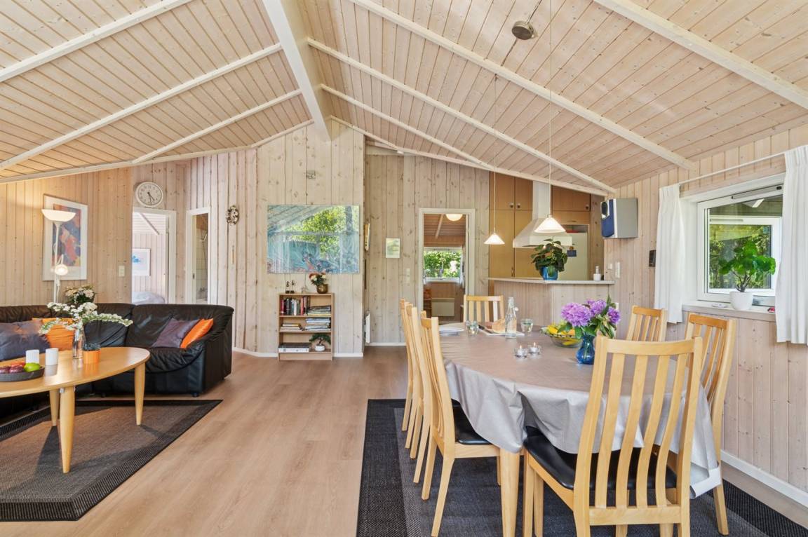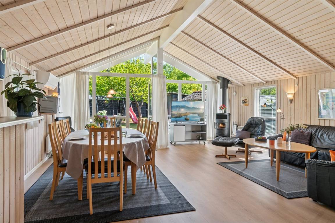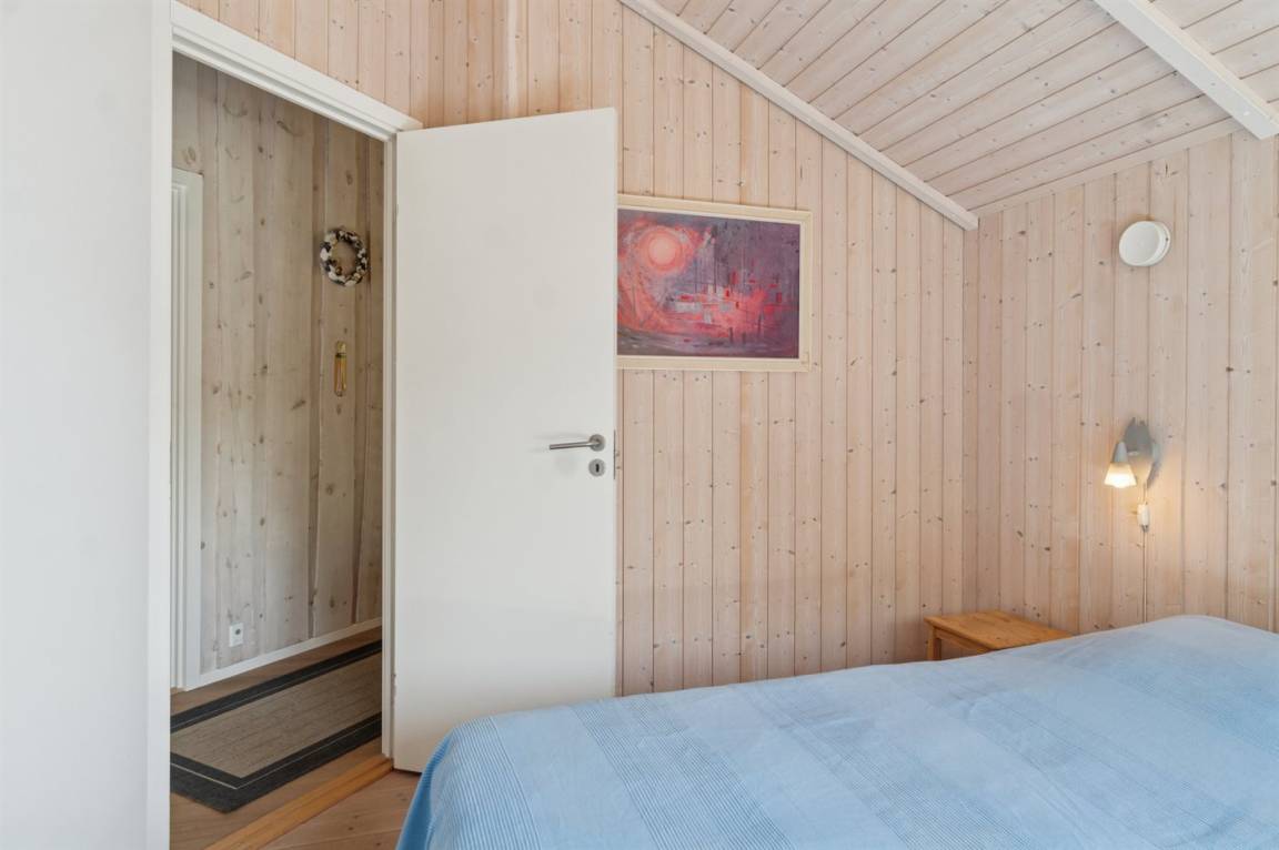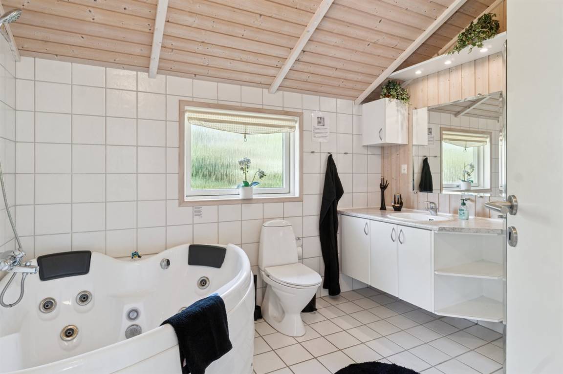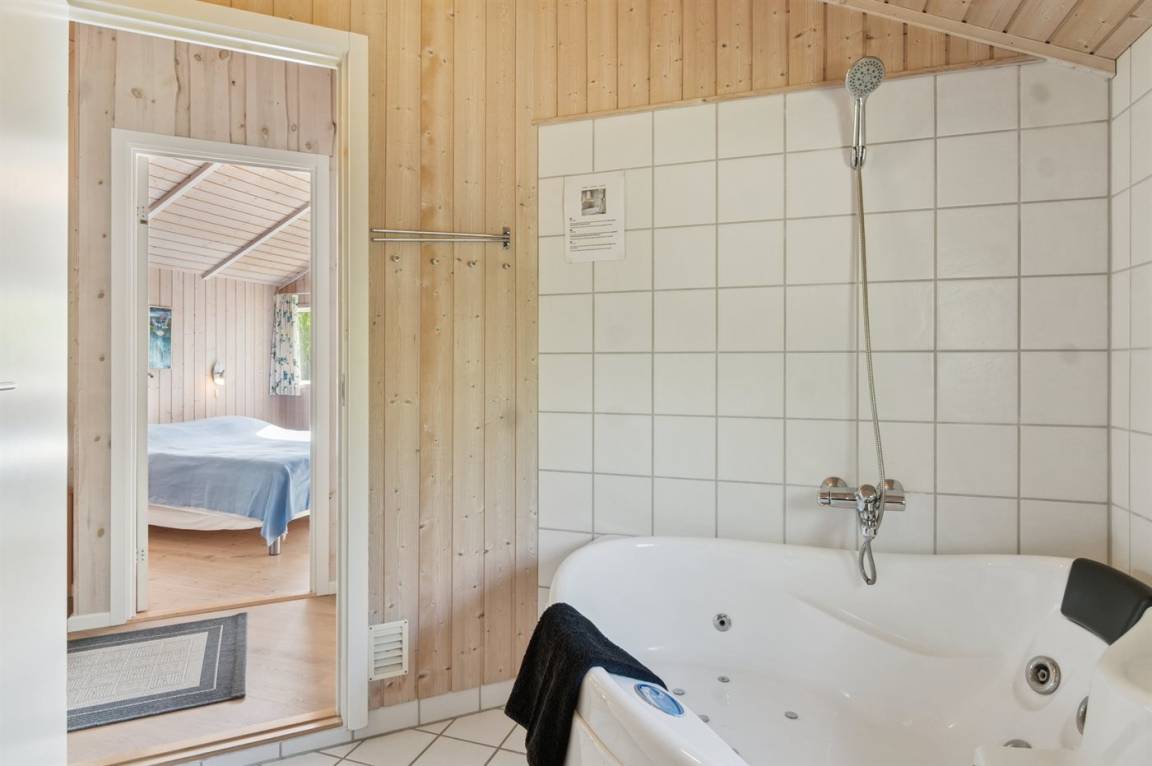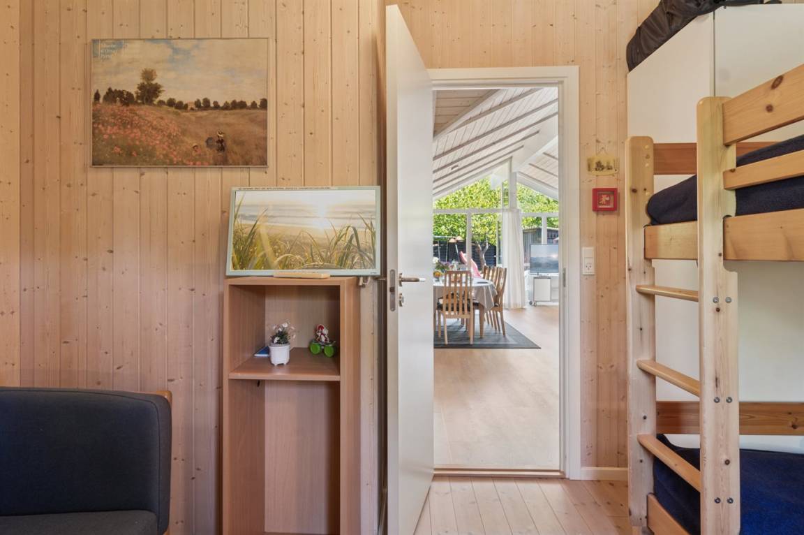 Auf einem Naturgrundstück nur 250 m vom Badestrand entfernt liegt dieses schöne Ferienhaus aus Holz mit Whirlpool und Sauna, 2002 gebaut. Zum Haus gehört sowohl offene als auch überdachte Terrasse mit Gartenmöbeln. Innen gibt es Holzböden. Das Haus ist mit 2 Badezimmern mit Dusche eingerichtet. Das eine ist ferner mit Fußbodenheizung, 3-Pers. Whirlpool und Zutritt zur Sauna des Hauses ausgestattet. Moderne Küche in offener Verbindung mit dem Wohnzimmer mit u. a. Geschirrspüler, Mikrowelle, Tiefkühlgerät und Herd mit Ceran-Feld. Das helle Wohnzimmer enthält Kaminofen, TV, Chromecast, DVD-Spieler sowie Stereoanlage mit CD-Spieler. Es können keine Fernsehsender empfangen werden - nur Streaming. Die 8 Schlafplätze verteilen sich auf 4 Schlafzimmer; 3 mit Doppelbett und 1 mit Etagenbett. Zusätzliches TV mit eingebautem DVD-Spieler in dem einen Schlafzimmer. An weiterer Ausstattung können kostenlose, kabellose Internetverbindung (Computer ist mitzubringen), Waschmaschine sowie Wäschetrockner erwähnt werden und es ist eine energiesparende Wärmepumpe installiert. Für die kleinen Feriengäste stehen Kinderbett, Kinderhochstuhl, Schaukel, Rutsche und Sandkasten bereit.