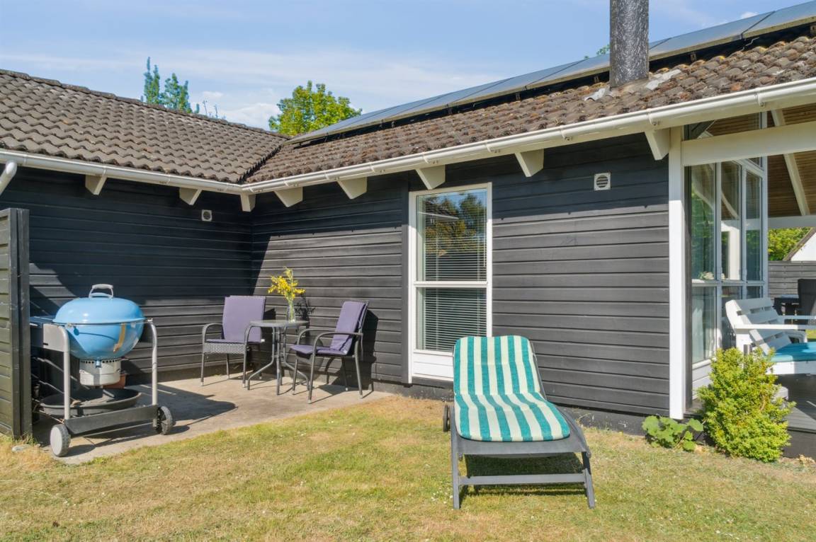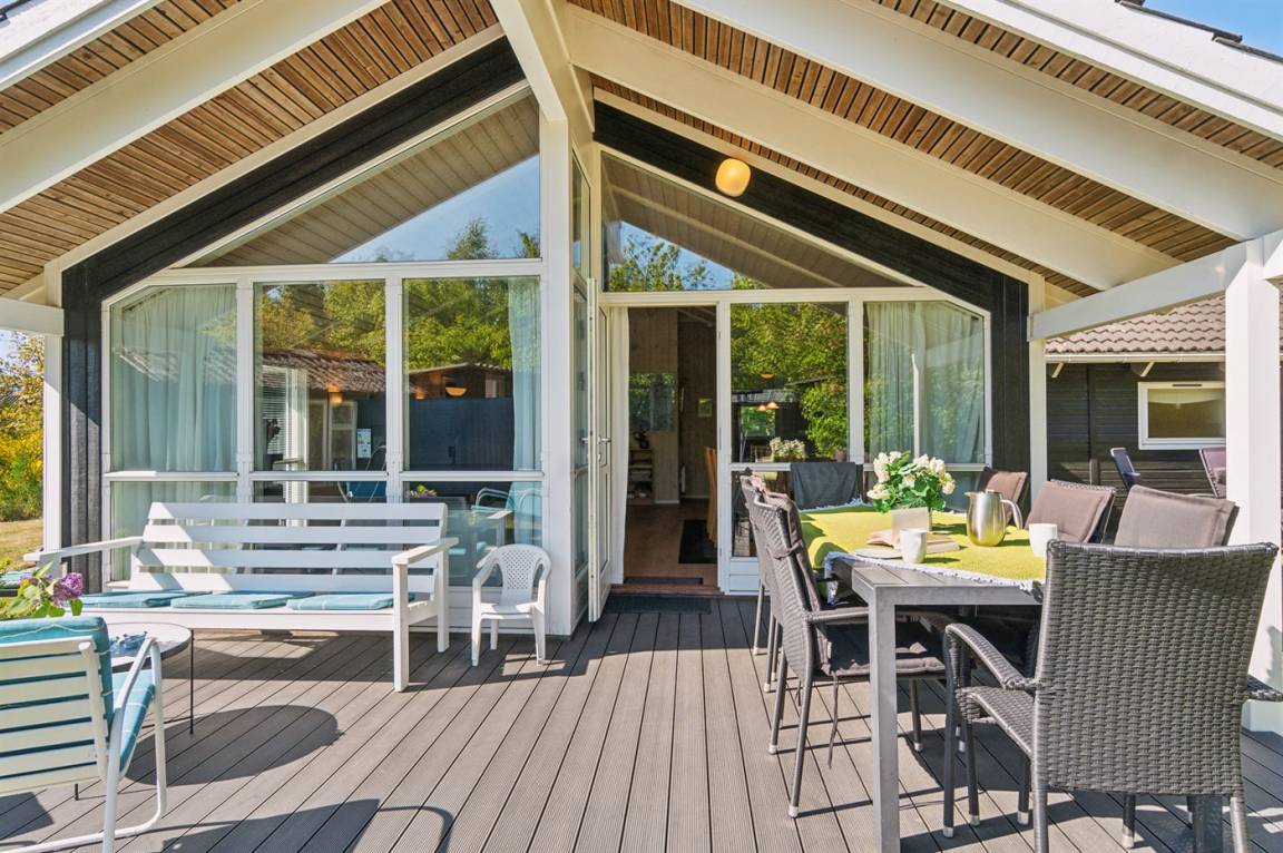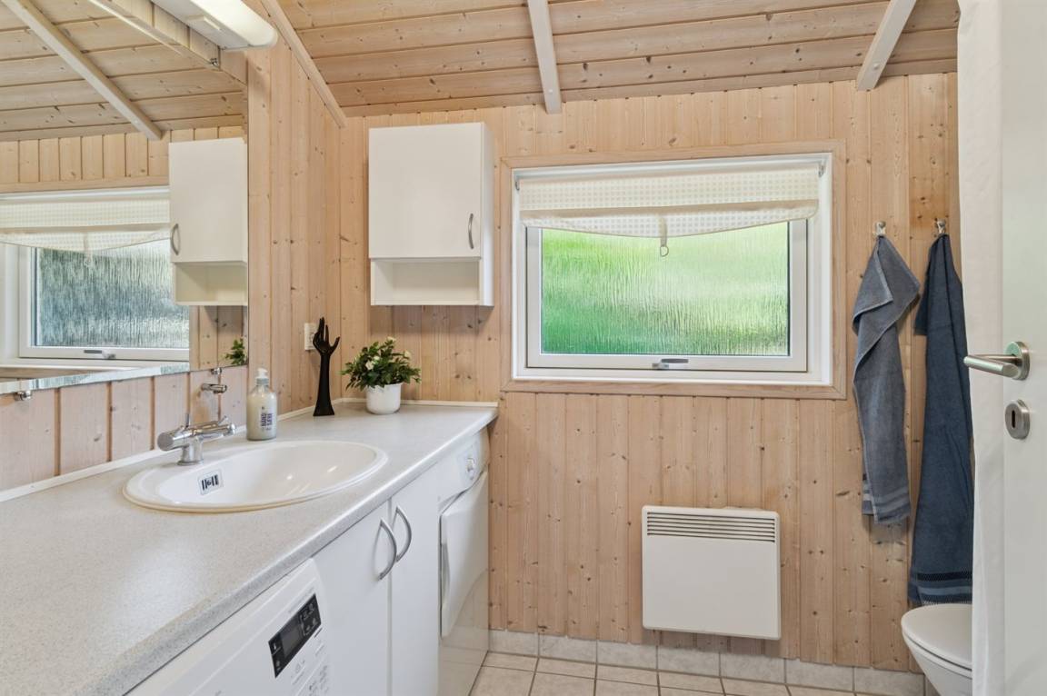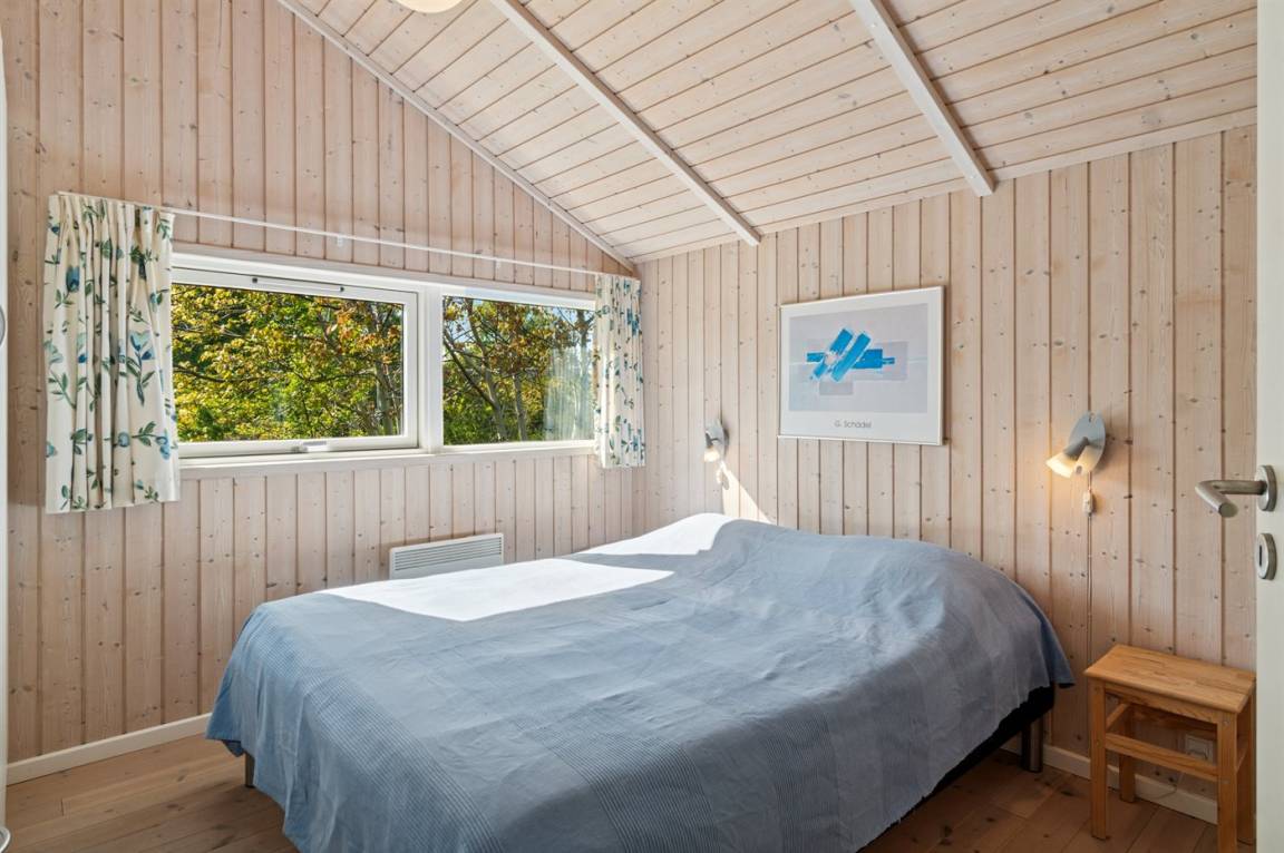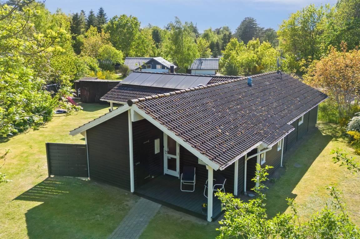 Auf einem Naturgrundstück nur 250 m vom Badestrand entfernt liegt dieses schöne Ferienhaus aus Holz mit Whirlpool und Sauna, 2002 gebaut. Zum Haus gehört sowohl offene als auch überdachte Terrasse mit Gartenmöbeln. Innen gibt es Holzböden. Das Haus ist mit 2 Badezimmern mit Dusche eingerichtet. Das eine ist ferner mit Fußbodenheizung, 3-Pers. Whirlpool und Zutritt zur Sauna des Hauses ausgestattet. Moderne Küche in offener Verbindung mit dem Wohnzimmer mit u. a. Geschirrspüler, Mikrowelle, Tiefkühlgerät und Herd mit Ceran-Feld. Das helle Wohnzimmer enthält Kaminofen, TV, Chromecast, DVD-Spieler sowie Stereoanlage mit CD-Spieler. Es können keine Fernsehsender empfangen werden - nur Streaming. Die 8 Schlafplätze verteilen sich auf 4 Schlafzimmer; 3 mit Doppelbett und 1 mit Etagenbett. Zusätzliches TV mit eingebautem DVD-Spieler in dem einen Schlafzimmer. An weiterer Ausstattung können kostenlose, kabellose Internetverbindung (Computer ist mitzubringen), Waschmaschine sowie Wäschetrockner erwähnt werden und es ist eine energiesparende Wärmepumpe installiert. Für die kleinen Feriengäste stehen Kinderbett, Kinderhochstuhl, Schaukel, Rutsche und Sandkasten bereit.