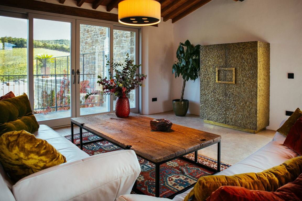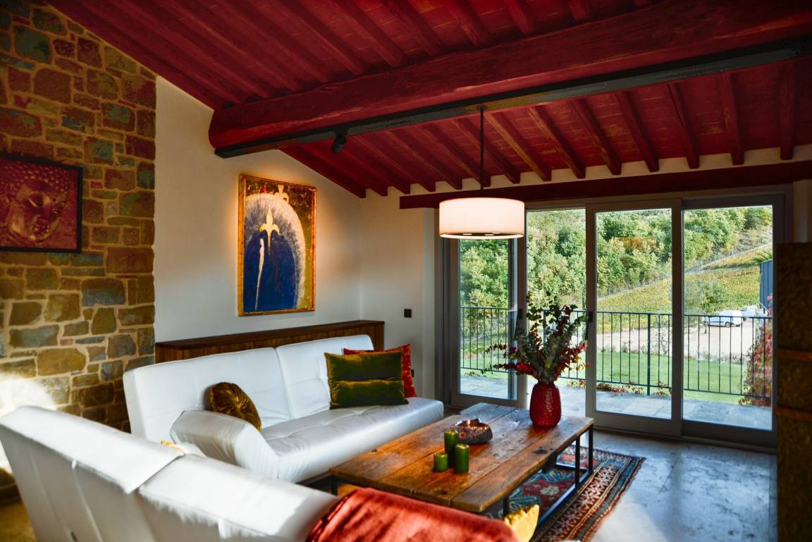 Wohnzimmer: zwei Sofas, Kamin, Esstisch (Personen: 8), WiFi Internet, Klimaanlage, Ausgang auf den Garten, Ausgang auf die Terrasse.