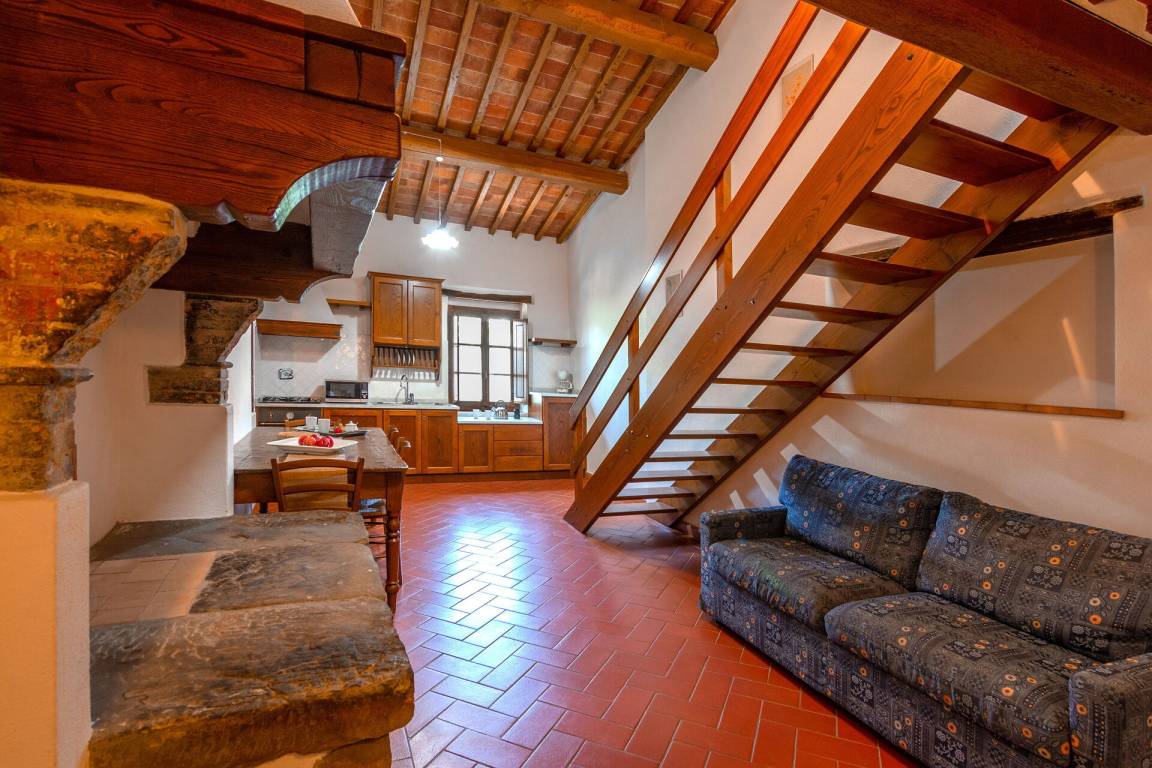Wohnküche: Esstisch, Spülmaschine, Kühlschrank, Mikrowelle, Herd, Italienische Kaffeemaschine, Sofa, Kamin.