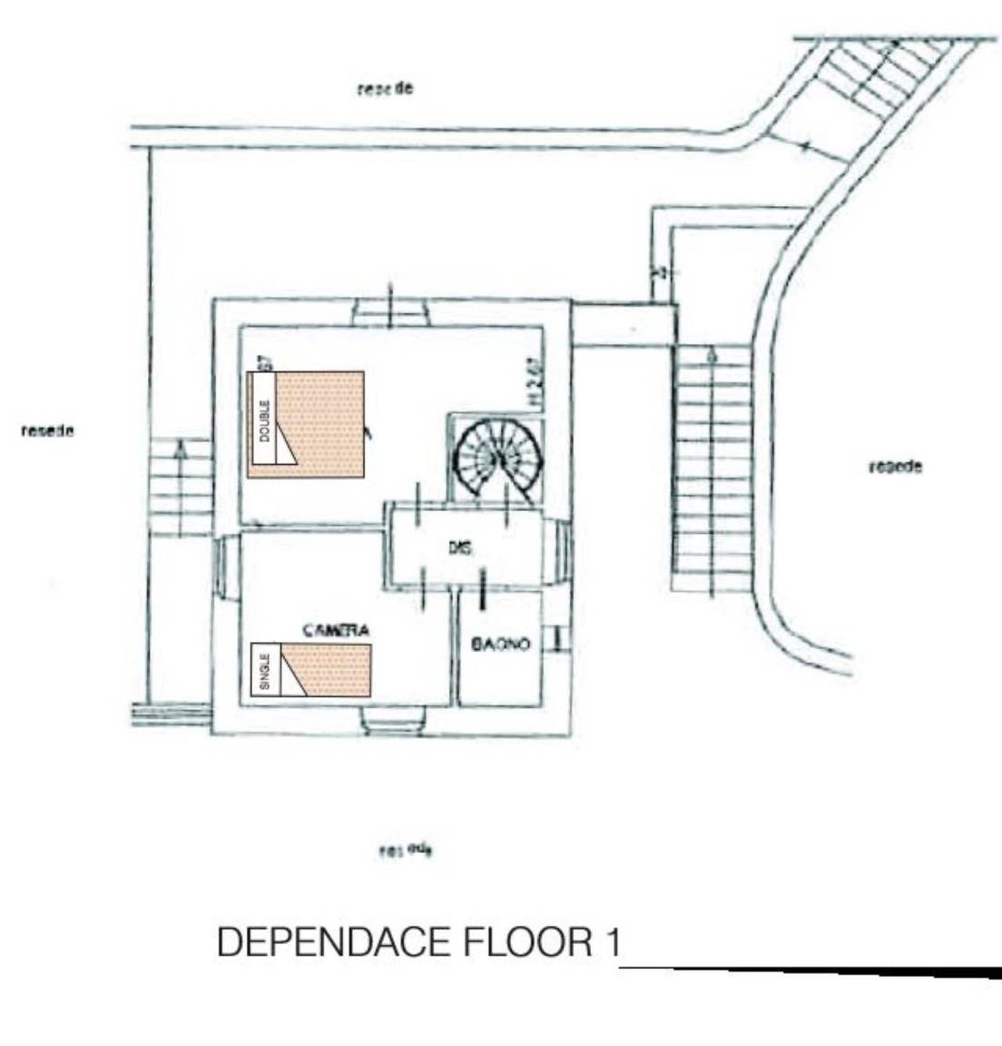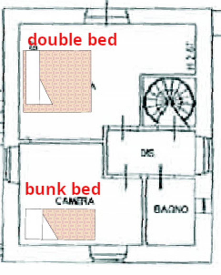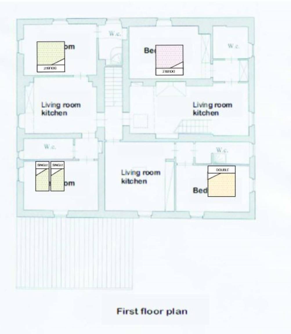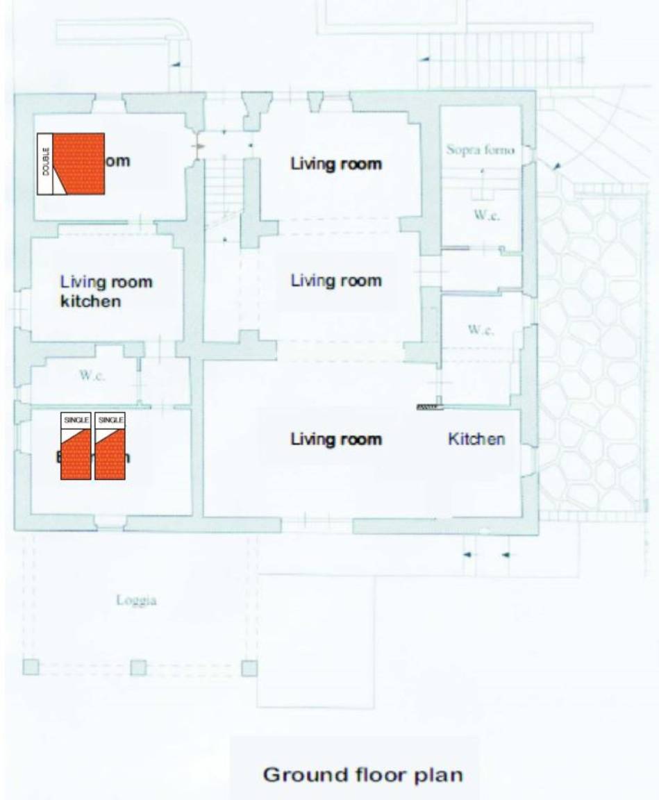 Annex:auf zwei Etagen mit Küche und Wohnzimmer (Esstisch, Herd, Kühlschrank, Gefrierschrank), einem kleinen Bad mit Waschbecken, WC und Dusche im EG; im 1. Stock ist ein Schlafzimmer mit Doppelbett, ein Schlafzimmer mit einem Einzelbett und ein Bad mit Waschbecken, Bidet, kleine Dusche, WC. Der Zugang zum Annex ist sowohl aus dem Erdgeschoss als auch aus dem 1. Stock möglich.