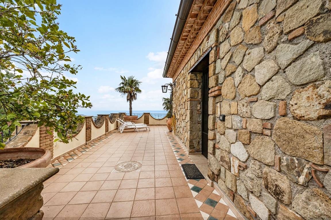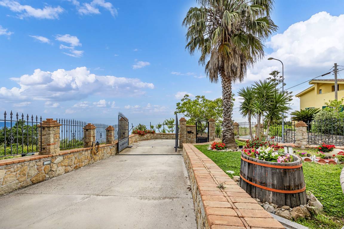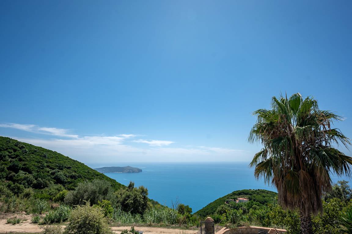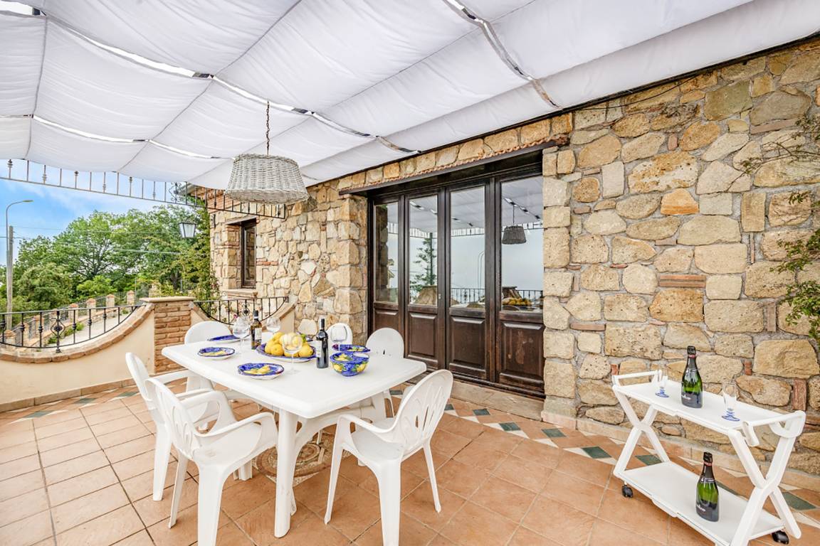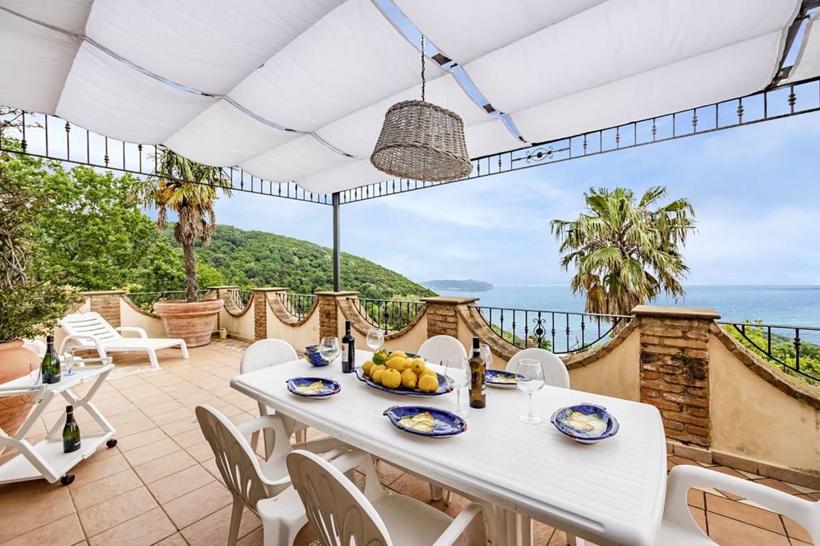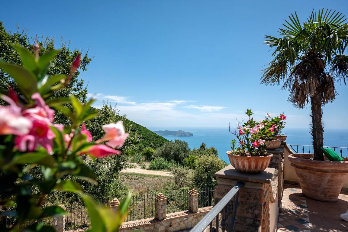 Ohne jeden Zweifel ist die ca. 100 qm große Meerblickterrasse das Herzstück der Ferienwohnung. Sie bietet einen fantastischen und unverstellten Blick auf das ca. 13 km entfernt liegende Kap von Palinuro. Die Terrasse ist möbliert (Tisch, Stühle, Sonnenliegen, Grill) und der Treppenzugang durch ein Türgitter absperrbar. Ein Teil der Terrasse ist durch einen Stoff-Pavillon überdacht, der als Sonnenschutz dient.