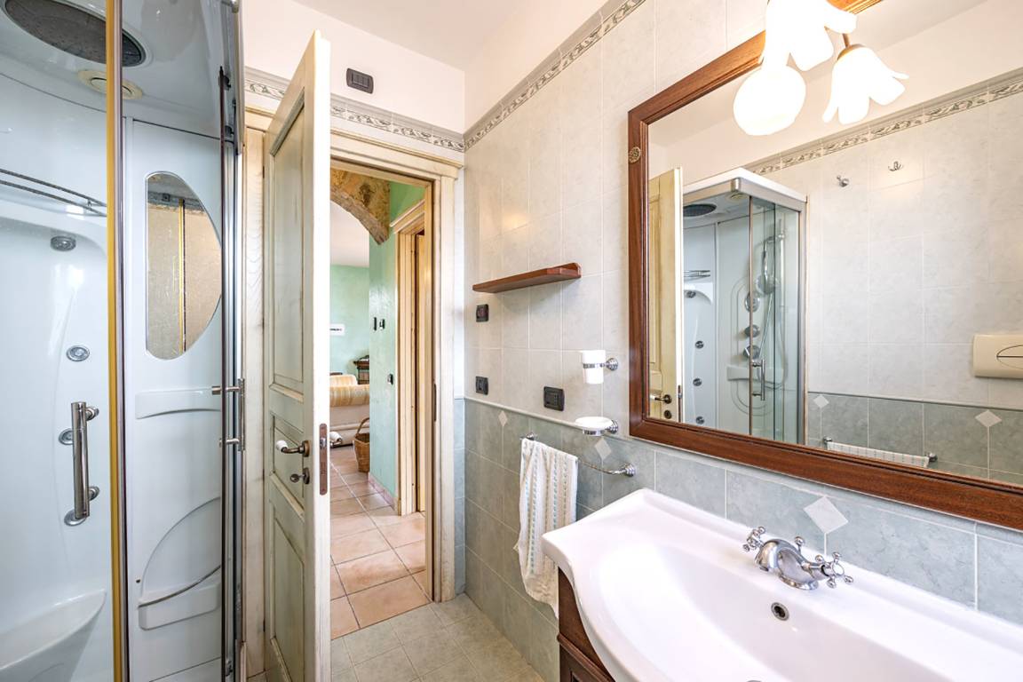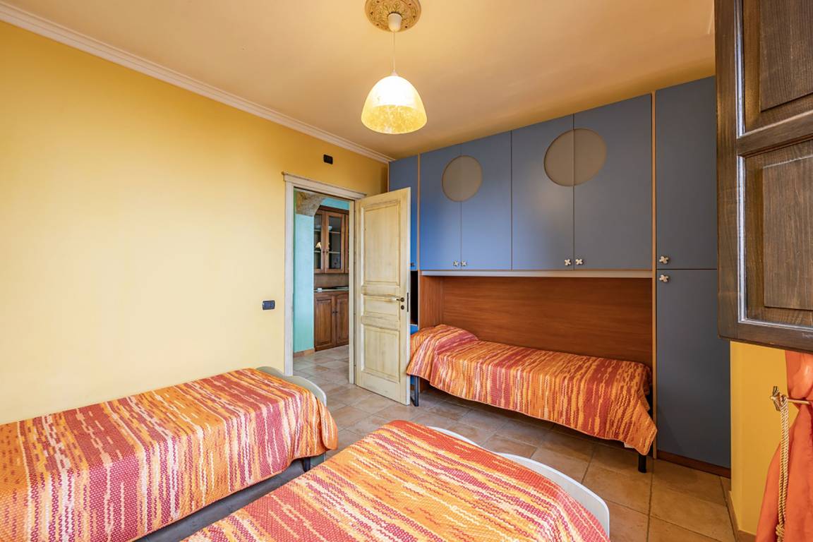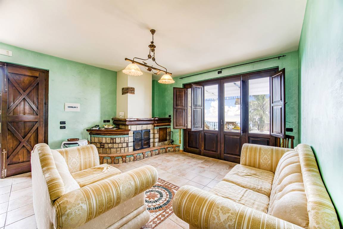 You enter Casa Pietralata into the living area with two sofas and fireplace and from where an arched opening lets you into the eat-in kitchen with masonry kitchen unit (incl. gas stove, oven, refrigerator with freezer compartment, dishwasher). While the living area opens onto the large sea view terrace, the kitchen opens onto a small outdoor area with a view of the evergreen hilly landscape.