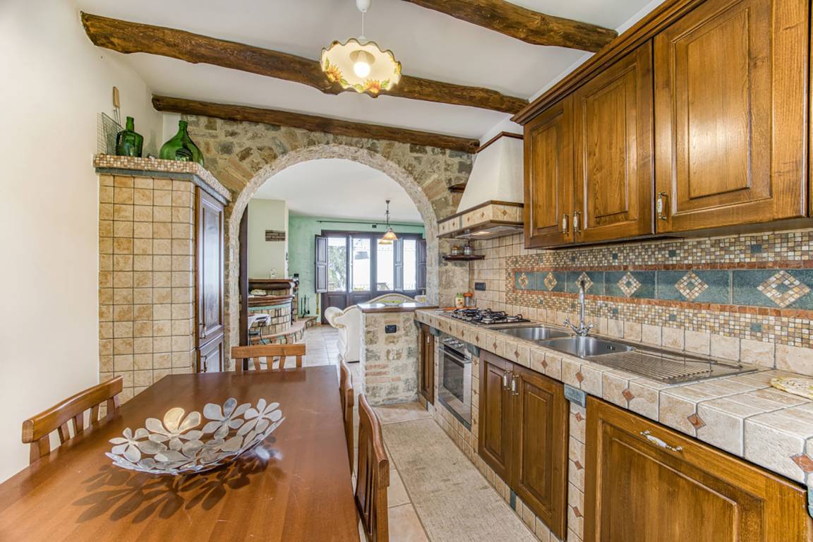 Man betritt die Casa Pietralata über den Wohnbereich, der durch einen Steinbogen optisch von der Küche getrennt ist. Vom Wohnbereich mit zwei Sofas und einem Kamin betritt man direkt die große Meerblickterrasse. Die Küche mit gemauerter Küchenzeile besitzt indes Zugang zu einem eigenen kleinen Außenbereich mit Blick in die immergrüne Hügellandschaft.