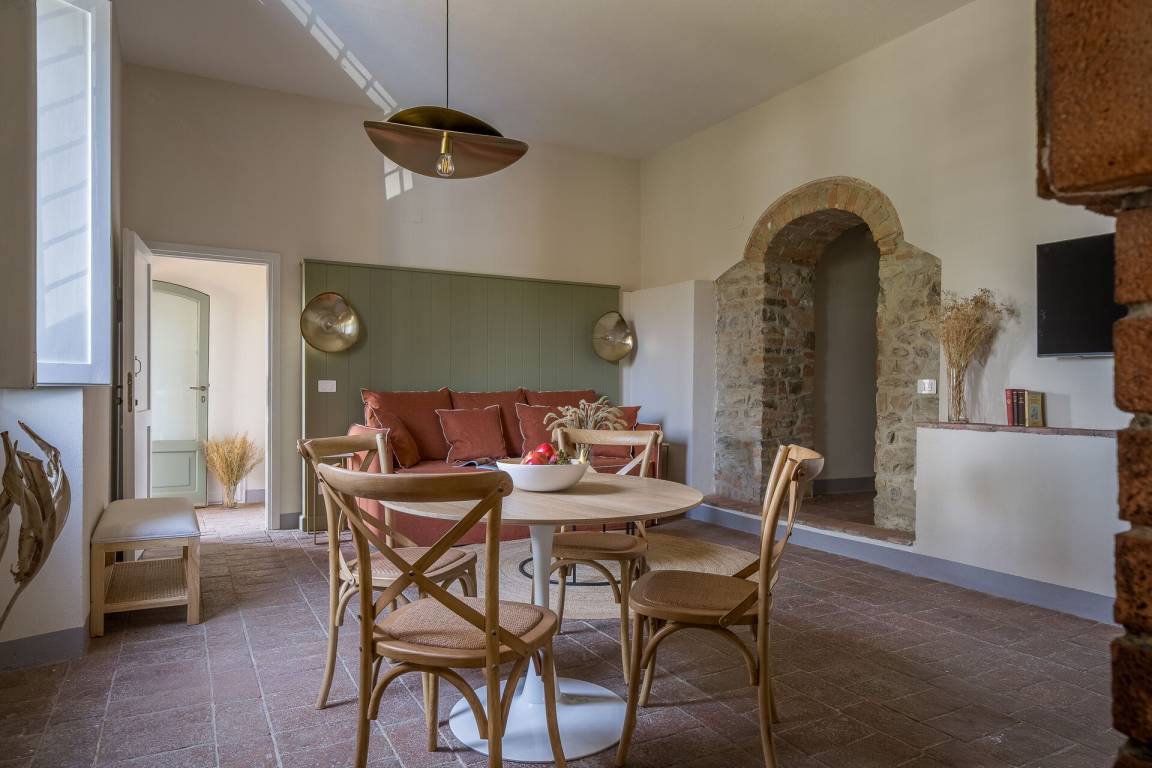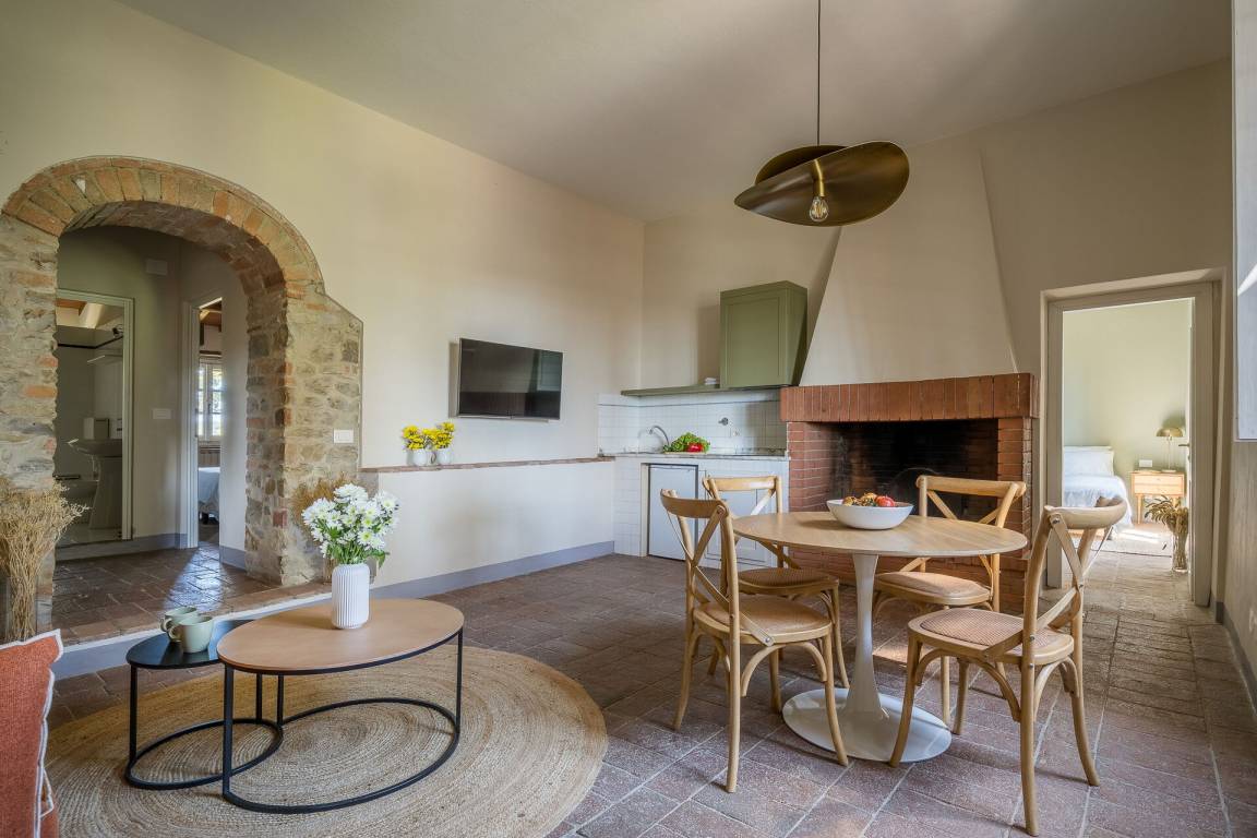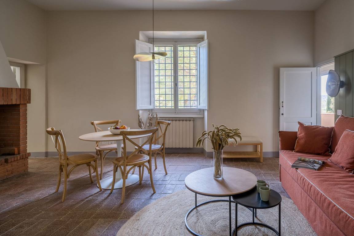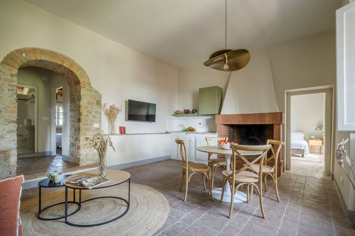 Relais Badia a Passignano - Appartamento Syrah (51 m²) ist eine zwei-Zimmer Wohneinheit, die auf eins Stockwerk gebaut ist, mit zwei Badezimmern. Hier können bis zu vier Leute schlafen.