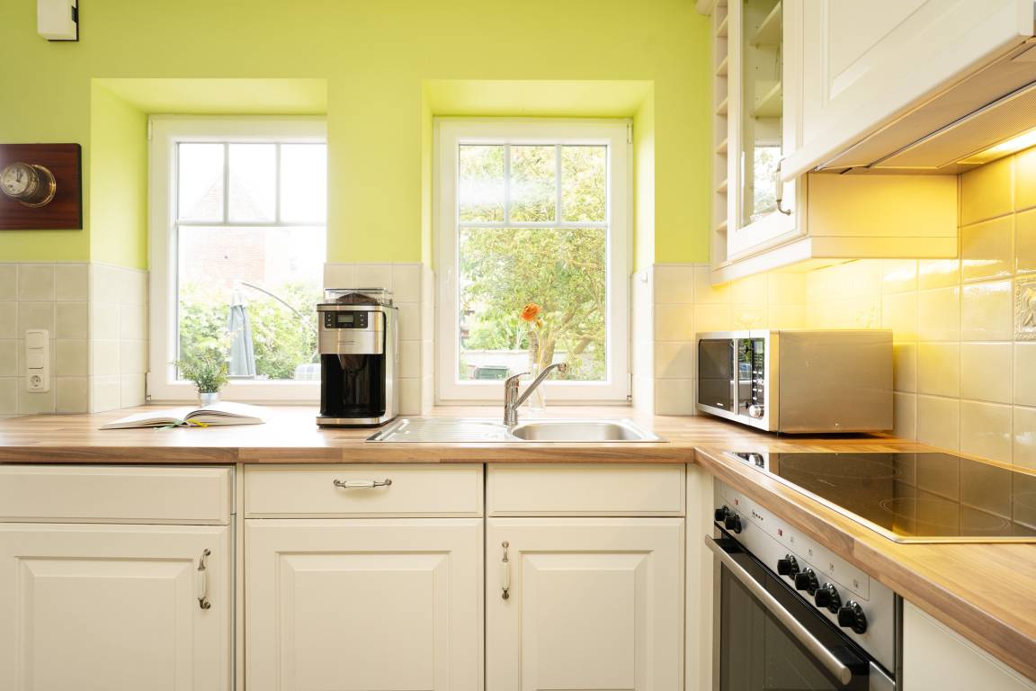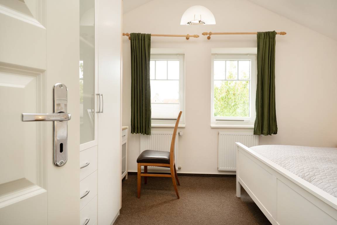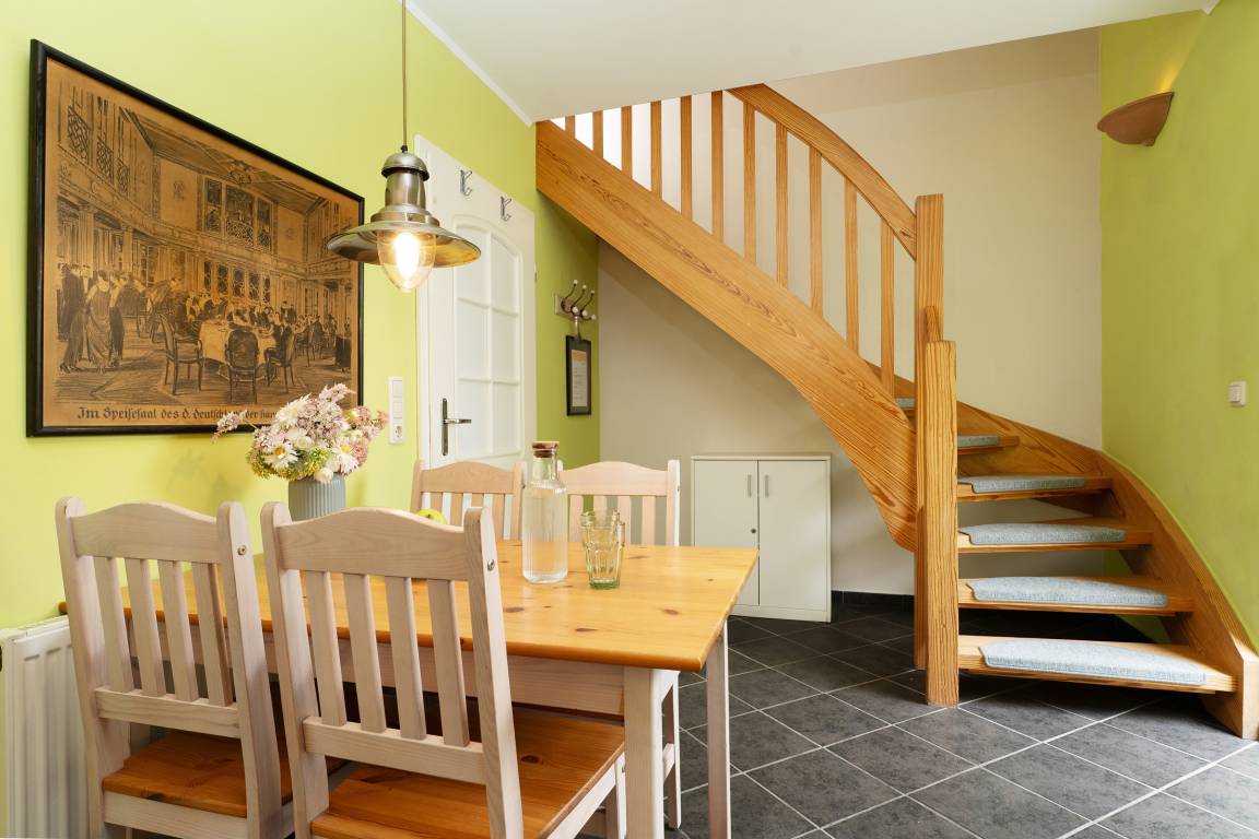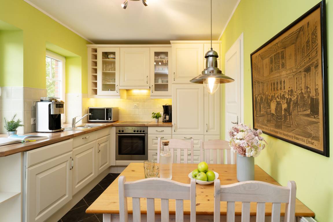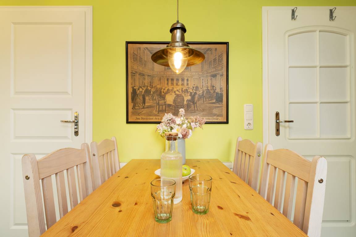Die helle Küche ist mit allem ausgestattet, was Sie für die Selbstversorgung benötigen: Ceran-Kochfeld, Backofen, Toaster, Wasserkocher und Kaffeemaschine sorgen für kulinarische Freiheit. Der Essbereich lädt zum Verweilen bei einem gemeinsamen Frühstück oder Abendessen ein. Das Schlafzimmer bietet ein komfortables Doppelbett mit ausreichend Stauraum und Verdunklungsmöglichkeiten.