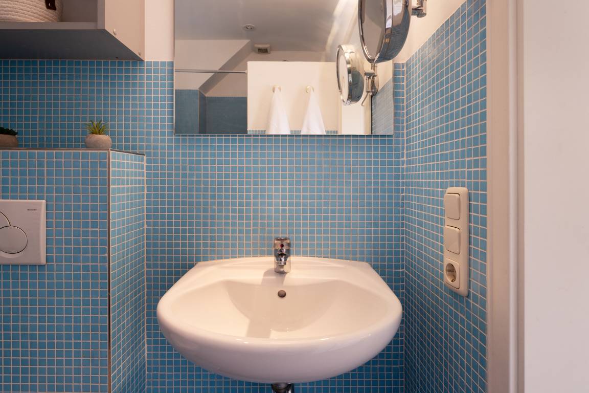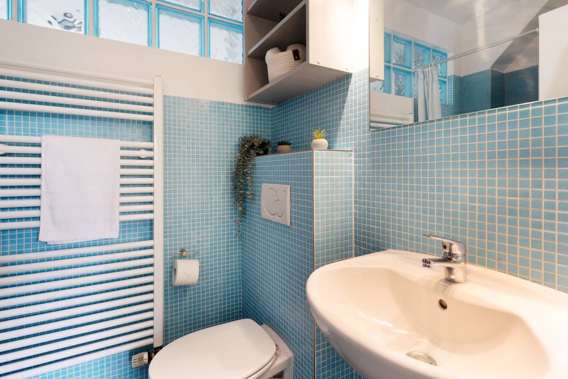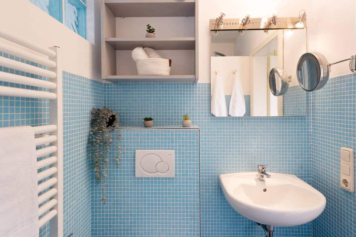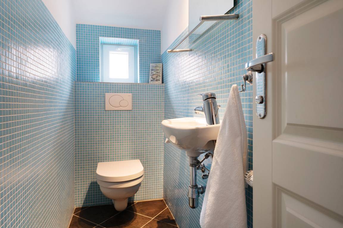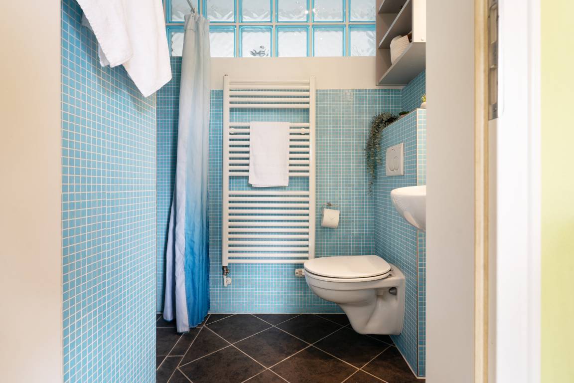 Das moderne Badezimmer ist mit einer bodengleichen Dusche und einem WC ausgestattet. Auch ein Haartrockner steht zur Verfügung. Für Familien mit Kleinkindern sind ein Kinderreisebett sowie ein Kinderhochstuhl vorhanden.