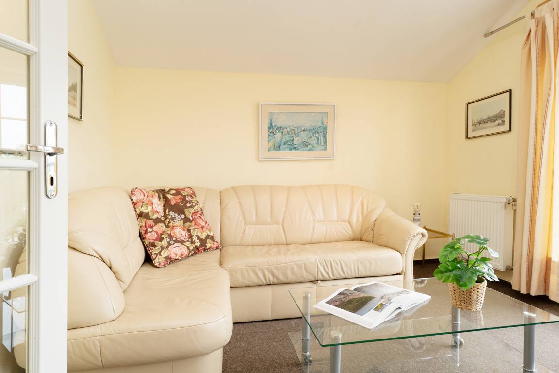 Diese charmante Ferienwohnung bietet Ihnen die perfekte Auszeit an der Ostsee. Der Wohnbereich ist gemütlich eingerichtet und verfügt über TV, CD-Player und Radio. Für entspannte Stunden steht ein bequemer Sitzbereich zur Verfügung. Vom Wohnraum aus gelangen Sie direkt auf die Terrasse mit Zugang zum Gemeinschaftsgarten, auf der Sie in bequemen Gartenmöbeln und einem eigenen Strandkorb den Blick ins Grüne genießen können.