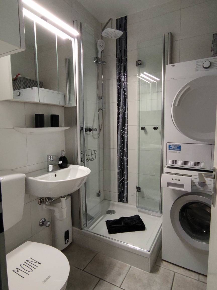 2023 renoviert! Das Bad ist ausgestattet mit einer Dusche, einem Waschbecken, Spiegelschrank, 1 Hängeschrank, WC, einer Waschmaschine und einem neuen Trockner. Die Handtücher, Zahnputzbecher,Kosmetikspiegel und ein Haartrockner liegen für sie bereit. Das Bad ist mit Fliesen und einem schönen Mosaikmuster an der Wand verlegt und hat einen Heißlüfter für kalte Tage.