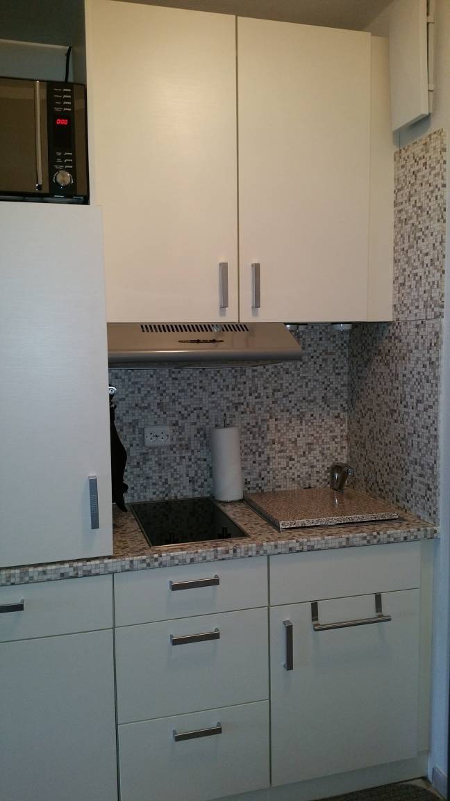 Sie ist komplett ausgestattet mit 2 Ceran-Kochfeldern, Dunstabzugshaube, einer Kombi-Mikrowelle mit Heißluftofenfunktion zum Backen, Geschirrspüler, Kühlschrank mit Gefrierfach, Tassimo, Kaffeemaschine, Toaster, Wasserkocher, Mixer, Waffeleisen, Geschirr, Töpfe, Eierkocher, Besteck u.s.w. Die Küche ist mit Fliesen verlegt.
