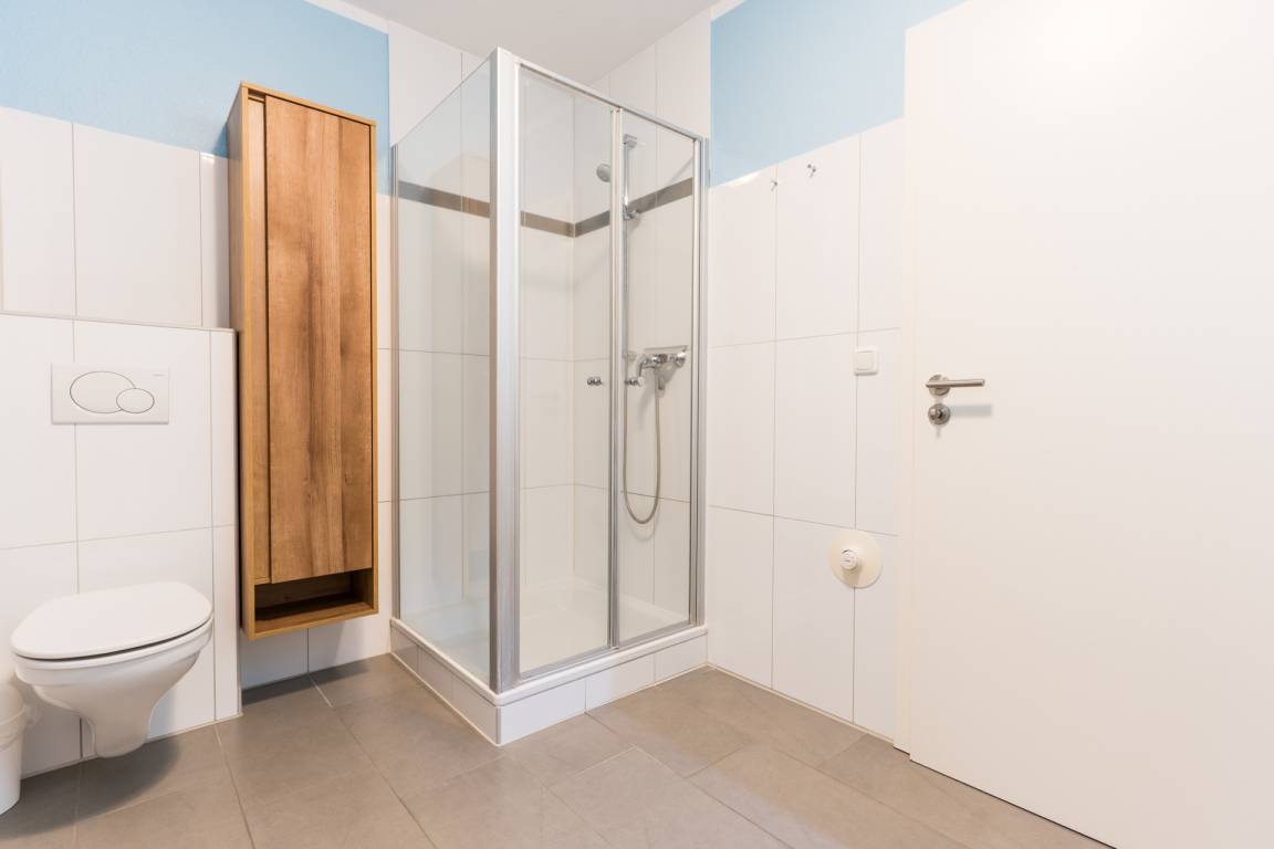 Die modernen Badezimmer mit Dusche verfügen über einen Handtuchheizkörper und Fußbodenheizung.
