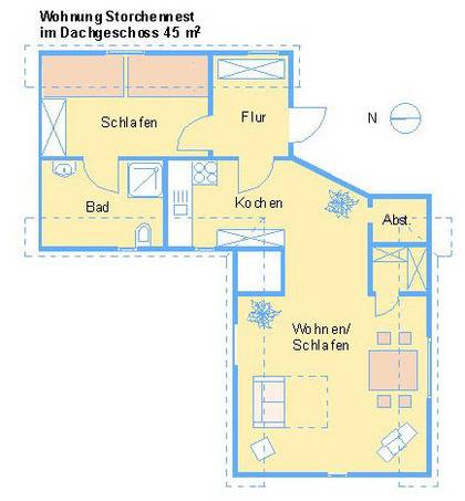 Sie besteht aus einem Wohn-Schlafraum, einem Schlafraum, einer Küche,einem Flur und einem Duschbad.