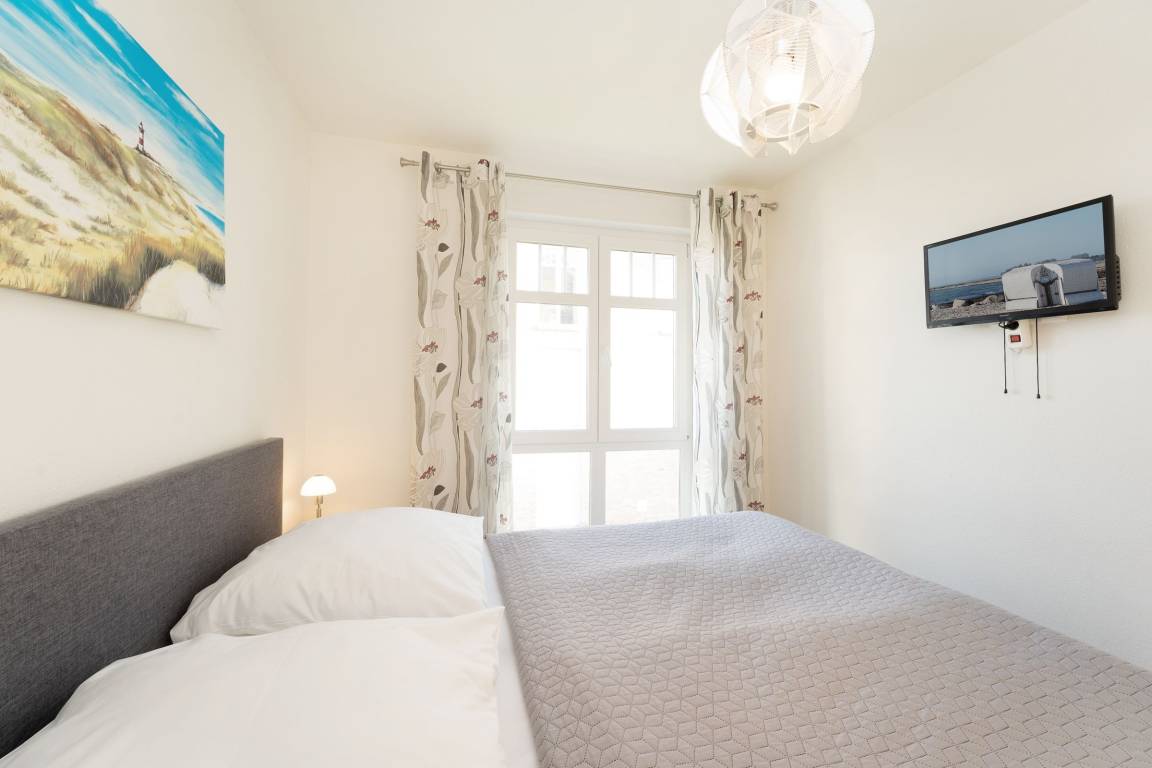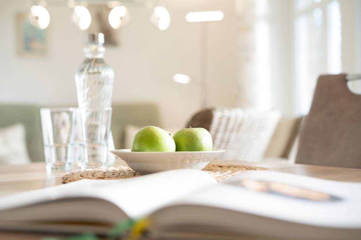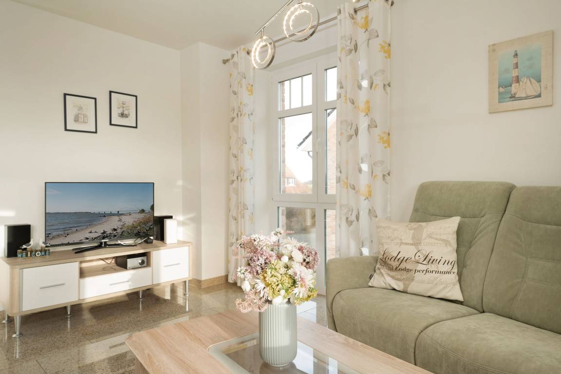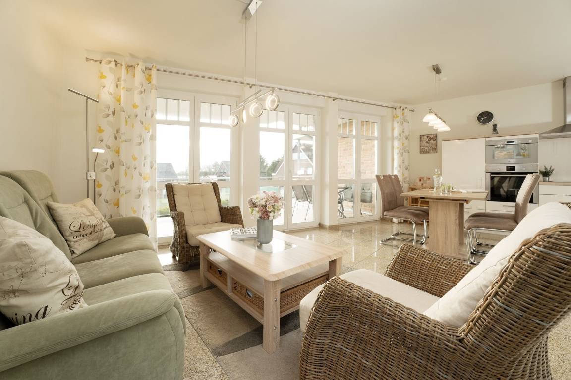 Der Wohn- und Essbereich mit angrenzender Küche ist hell und freundlich eingerichtet. Die Abende können Sie auf dem gemütlichen Sofa oder Sessel ausklingen lassen. Die moderne Küche verfügt zum Beispiel über ein Induktionskochfeld, einen Backofen auf Körperhöhe, einen Geschirrspüler und eine Kaffeemaschine. Das Hauptschlafzimmer ist mit einem komfortablen Boxspringbett (180x200 cm) ausgestattet, das kleinere Schlafzimmer mit einem modernen Einzelbett (100x200 cm) mit ausziehbarem, weiteren Schlafplatz. Fernseher sind jeweils im Wohnzimmer, Kinderzimmer und im Schlafzimmer vorhanden. Das Badezimmer überzeugt mit einem hochwertigen Waschtisch und einer Eckdusche. Die komplette Wohnung ist mit Fußbodenheizung ausgestattet. Der 15 m² große Balkon mit Blick zum Burger Binnensee rundet den perfekten Urlaubstag ab.