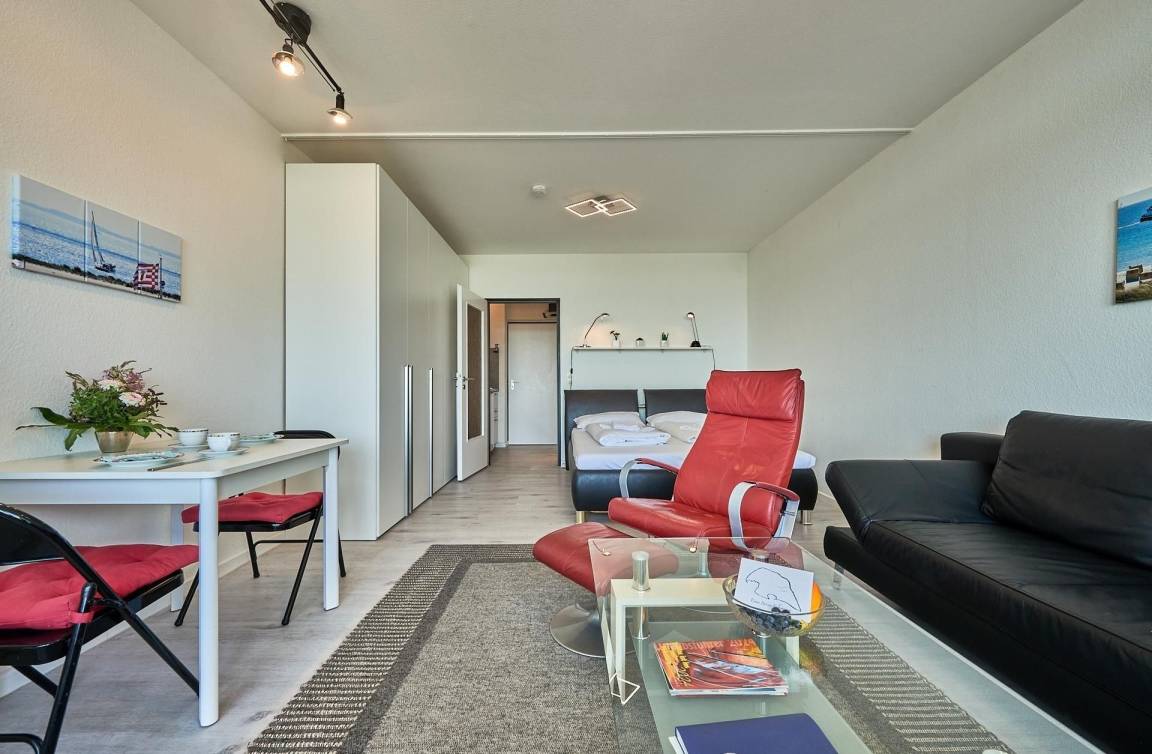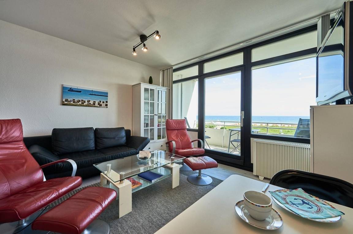 Wenn die Ostsee zum Baden einlädt, haben Sie es nicht weit: Es sind nur rund 100 Meter zum Strand. Die kleine, feine Wohnung punktet mit ihrer raffinierten Aufteilung. Das gemütliche Wohn-/Schlafzimmer verfügt über zwei bequeme Sessel mit passendem Fußhocker sowie ein kuscheliges Doppelbett (2x 80x200 cm) zum entspannten Schlafen. Der große möblierte Balkon mit fantastischem Ostseeblick wird bestimmt Ihr neuer Lieblingsplatz. Die Pantryküche im hinteren Bereich ist gut ausgestattet, sodass die Selbstversorgung sicher Spaß macht. Das moderne Duschbad bietet den Komfort, den man sich im Urlaub wünscht.