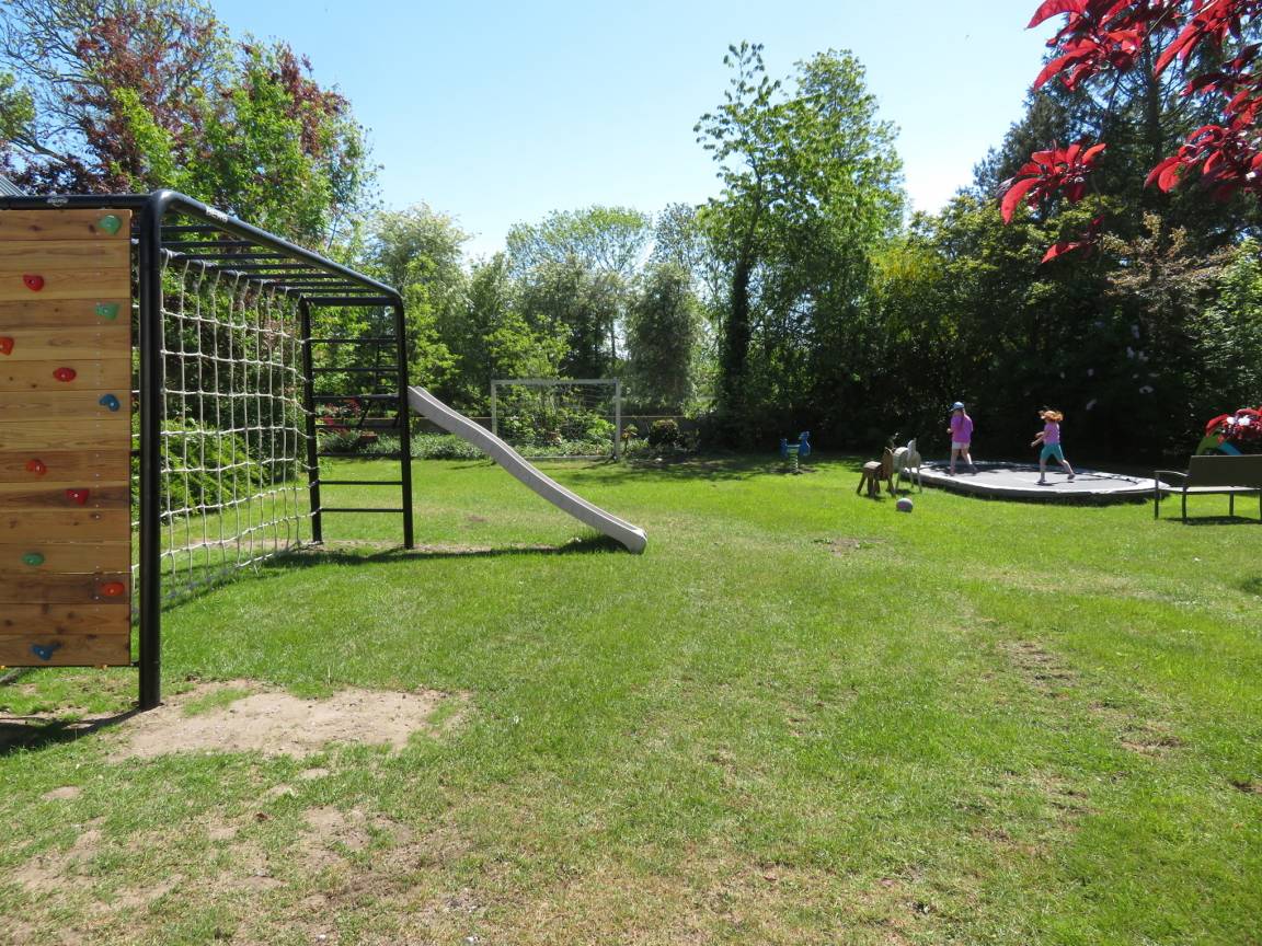 Außerdem haben wir eine Spielscheune mit Strohecke, Trampolin, Schaukeln, kleiner Rutsche und Spielhäuschen.