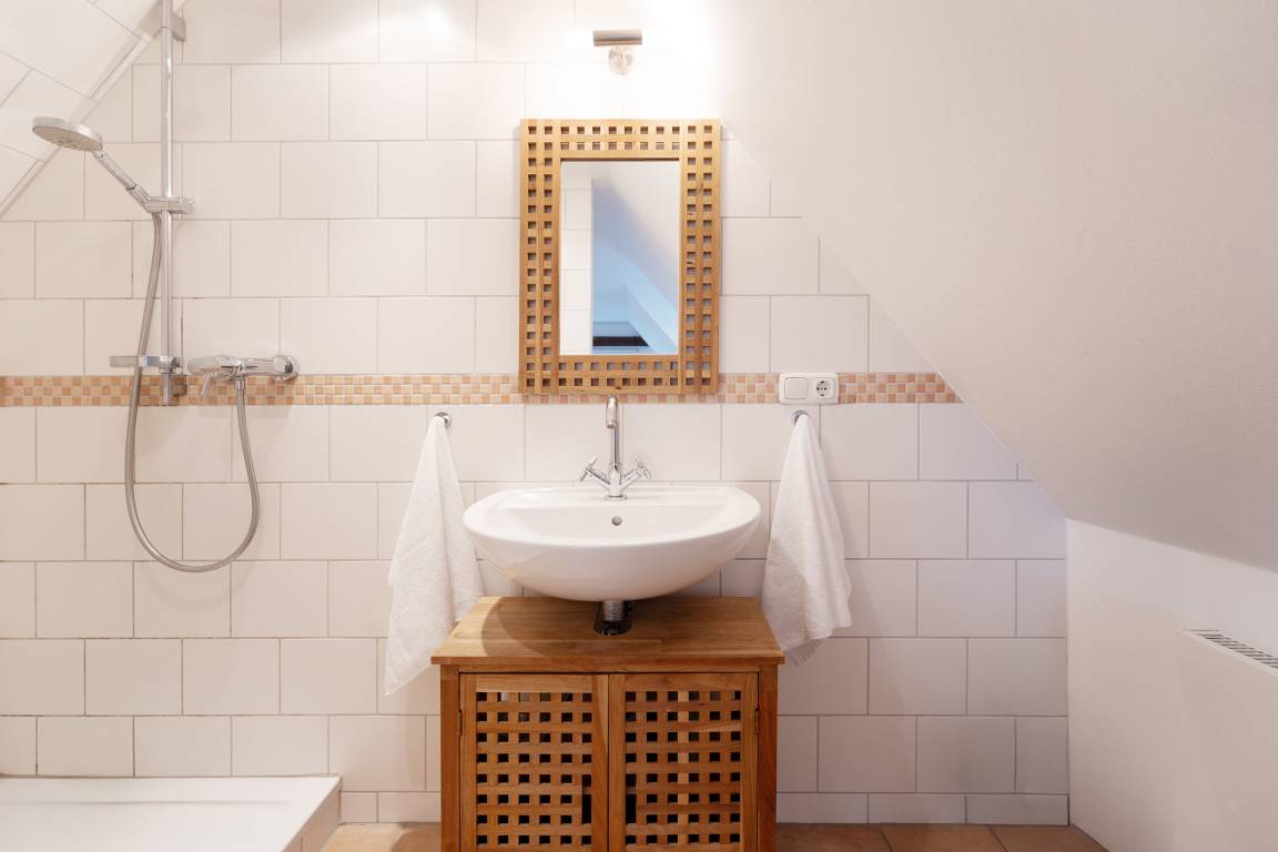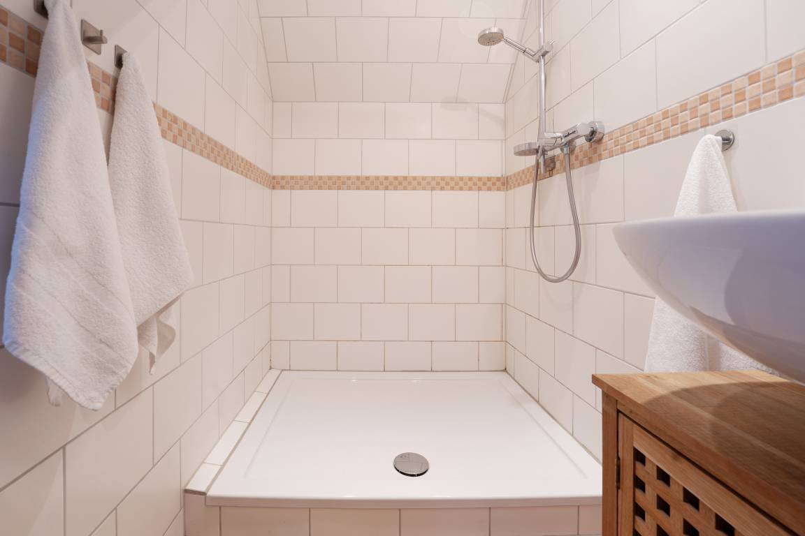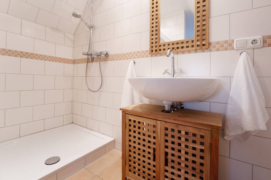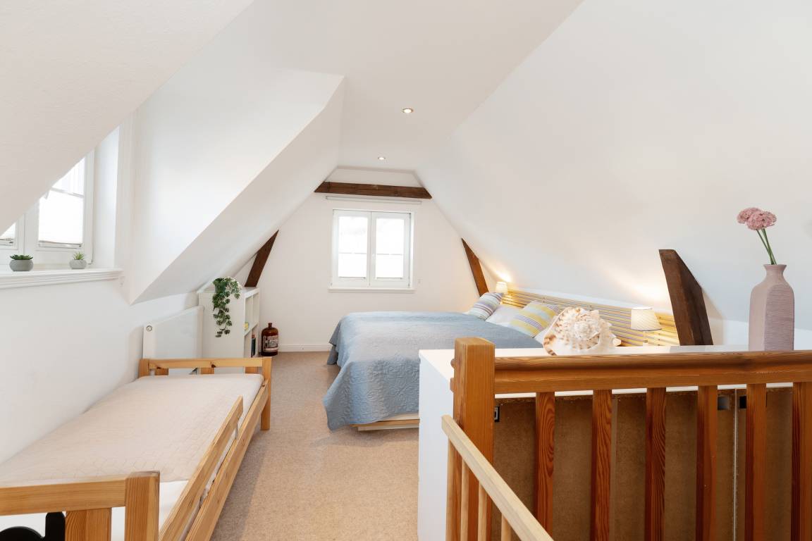Das Schlafzimmer im 1. OG lädt mit behaglicher Atmosphäre zum Erholen ein, im modernen Duschbad en Suite starten Sie frisch in den Tag. Ein Kinderreisebett und ein Hochstuhl stehen zur Verfügung.
