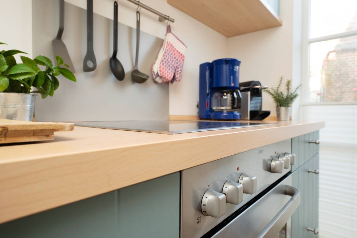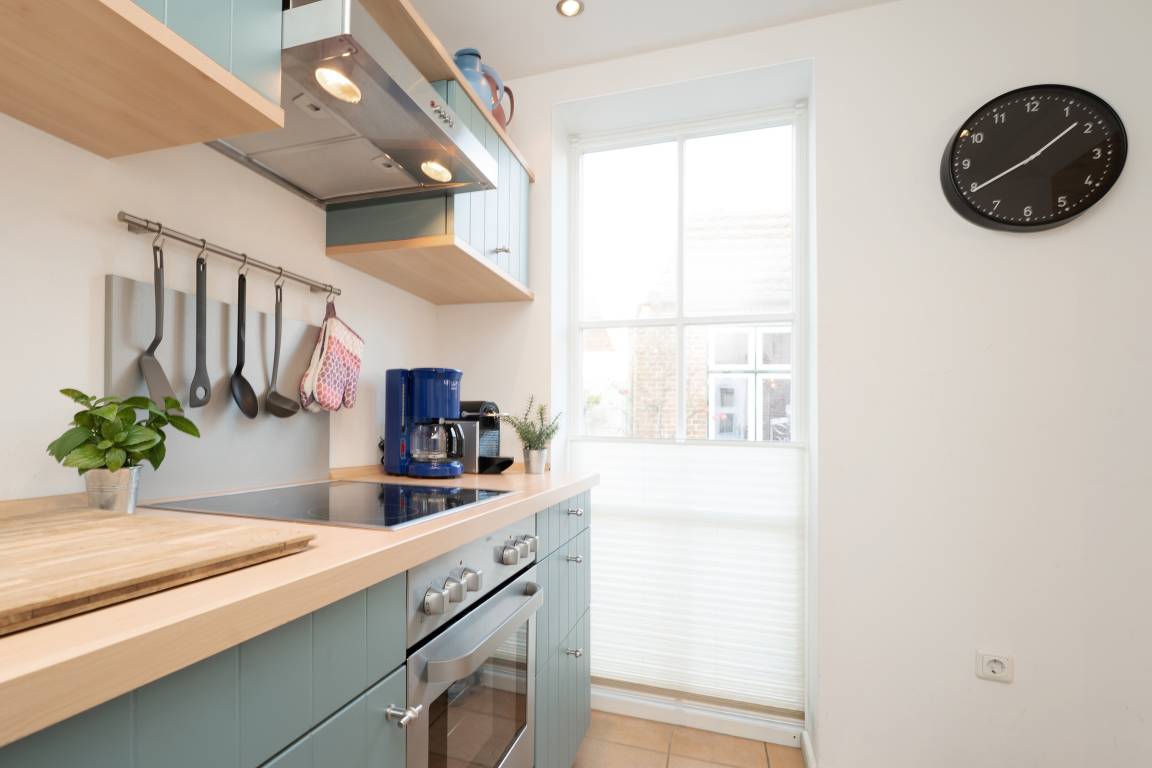 Im eingezäunten Gemeinschaftsgarten warten zudem Schaukel und Sandkasten auf die kleinen Gäste. Ein Kohlegrill ist ebenso vorhanden. Anschließend führt der Weg in die praktische Küchenzeile mit Nespresso-Kapselmaschine, die komplett für die unkomplizierte Selbstversorgung ausgestattet ist.