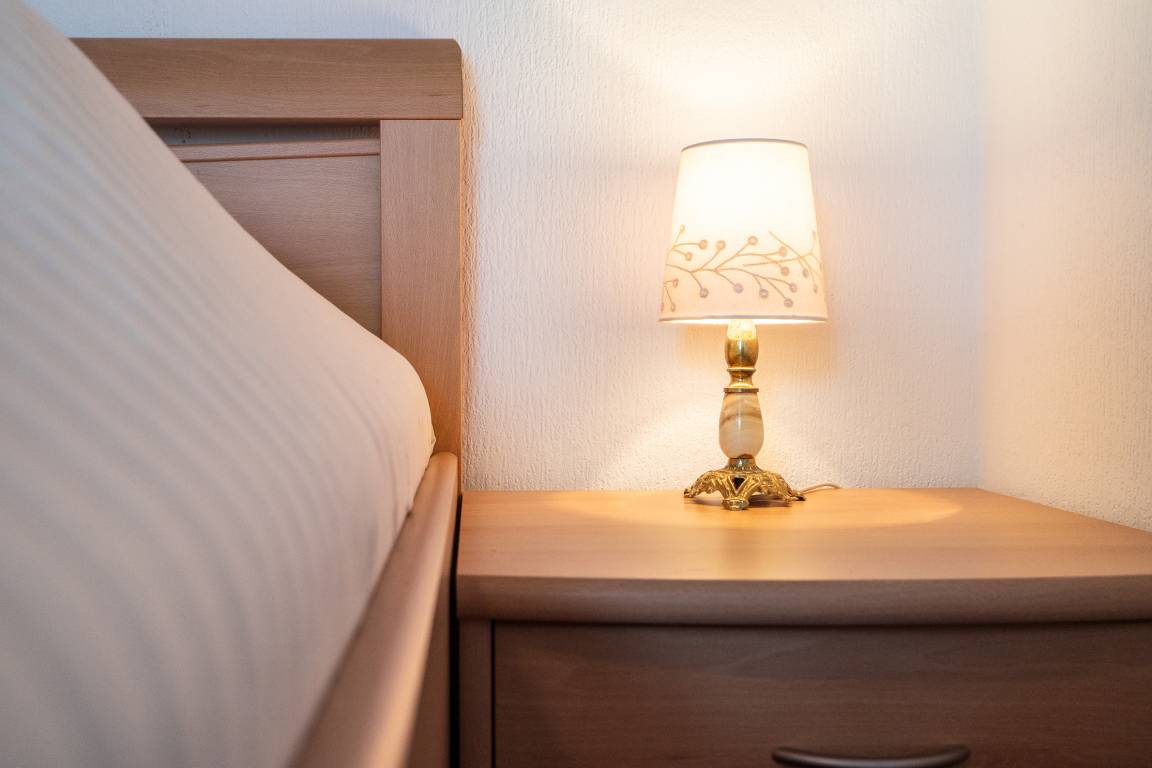 Schlafzimmer: 1 Doppelbett, Verdunkelung: Gardinen, Kleiderschrank, Platz für ein Babybett vorhanden