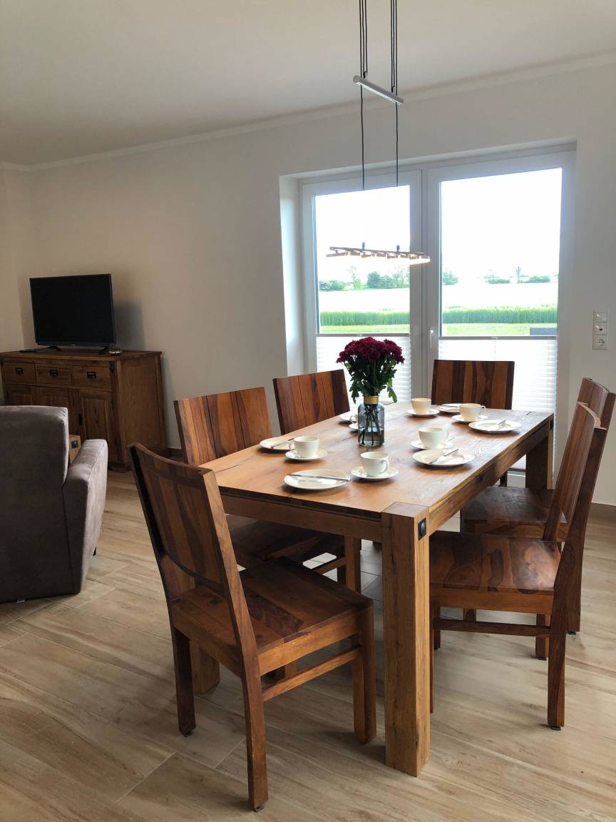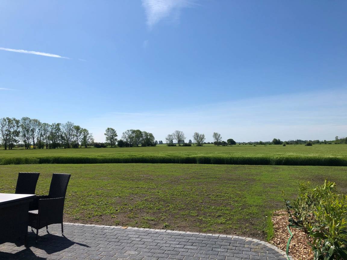 Die großen Fenster im Wohnbereich geben den Blick frei auf die Wiesen und Felder Fehmarns, welchen Sie sowohl aus der Küche als auch von der gemütlichen Wohnzimmer-Ecke mit Flat-TV genießen können.