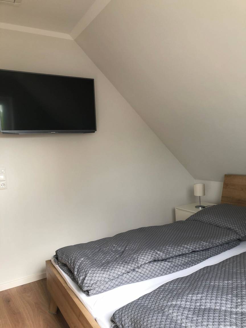 Vom Flur gelangen Sie über die schöne offene Vollholz-Treppe in das Obergeschoss. Dort befinden sich ein Schlafzimmer mit Doppelbett und ein Schlafzimmer mit drei Einzelbetten. Beide Zimmer sind mit einem Kleiderschrank und Nachttischen für jedes Bett ausgestattet. Das großzügige Bad mit Blick auf den Hof rundet das Angebot ab.
