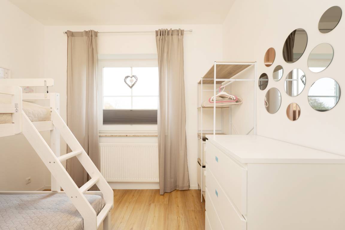 Schlafzimmer 2: 1 Etagenbett (unten Futon 140 cm breit, oben normal 90 cm breit), Kommode, Verdunkelung: Plissee