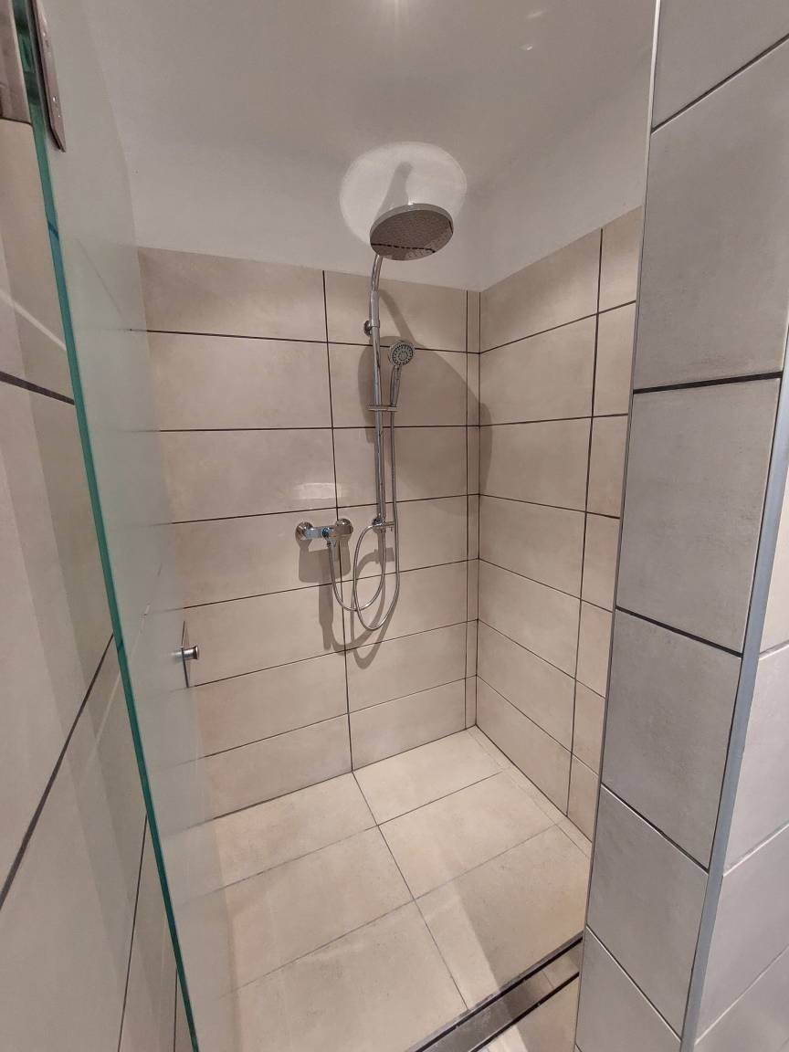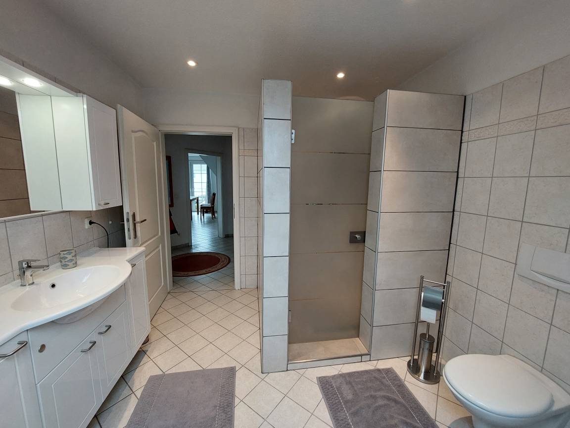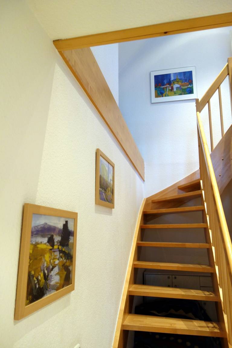 Über das zur Wohnung gehörende Treppenhaus gelangt man in den ersten Stock, wo sich hinter dem Flur das schöne großzügige Wohnzimmer mit Sitzecke, TV, Kaminofen und Essecke, das geräumige Schlafzimmer, Bad, Küche und Flur befinden. Vom Wohn- und Schlafzimmer hat man Zugang zu einem kleinen Balkon .
