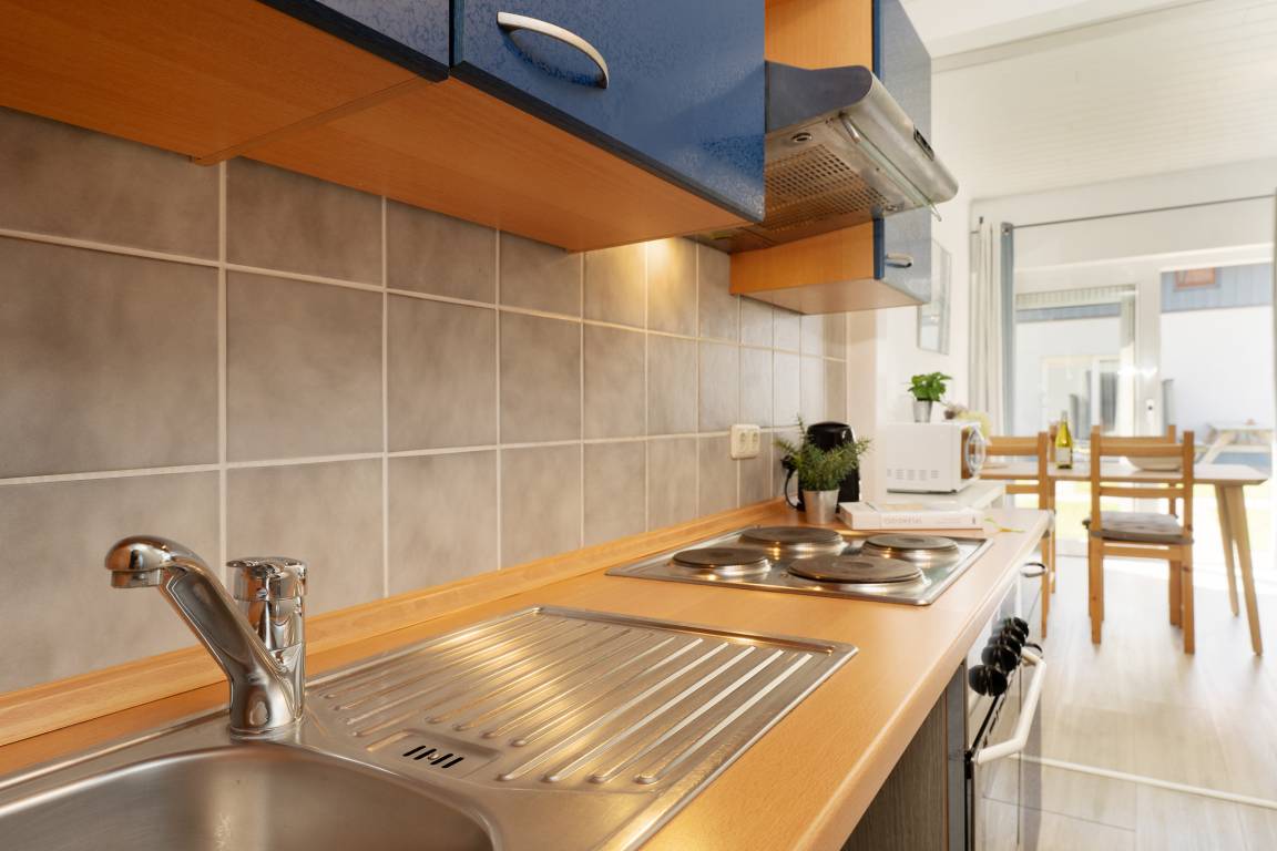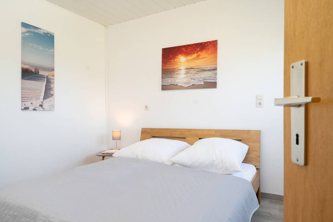 Der Wohnbereich lädt mit einem Fernseher und einem bequemen Sofa zu entspannten Stunden ein und bietet ausreichend Platz für gemeinsame Erholung. Die Terrasse und der Gemeinschaftsgarten sind mit Gartenmöbeln, Sonnenliegen und einem Strandkorb ausgestattet – ein wunderbarer Ort für eine Auszeit im Freien. Die offene Küche bietet eine umfassende Ausstattung u. a. mit Kühlschrank mit Gefrierfach, Herd, Wasserkocher sowie einer Kaffeemaschine – ideal für eine entspannte Selbstverpflegung. Zwei separate Schlafzimmer bieten jeweils ein bequemes Doppelbett für erholsamen Schlaf. Im Badezimmer stehen Ihnen eine Dusche, WC und ein Haartrockner zur Verfügung.