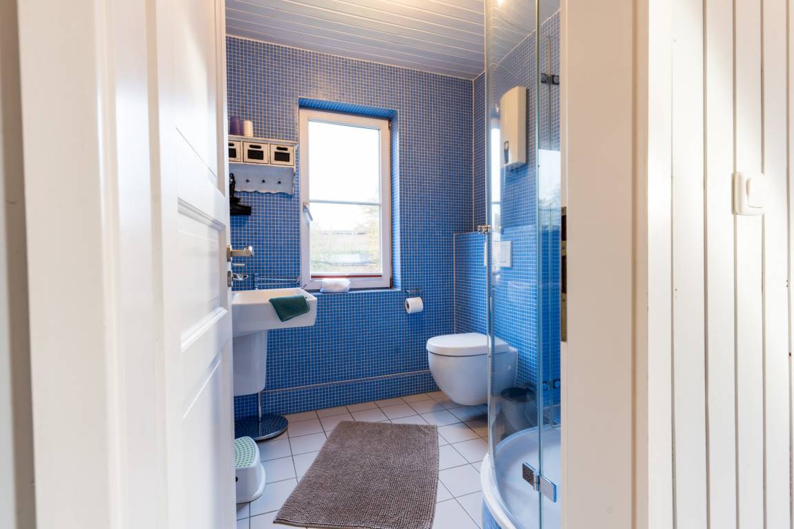 Ein Schlafzimmer mit 1 Doppelbett befindet sich im 1. Stockt, ebenso das Badezimmer mit Dusche.