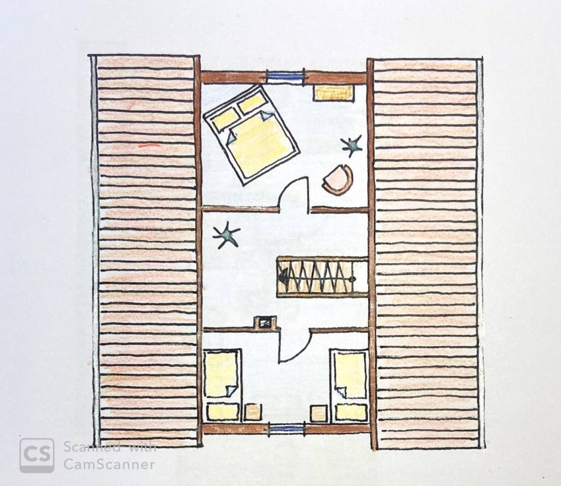 Im Dachgeschoss befinden sich zwei weitere Schlafzimmer: eins mit 1 französischen Bett und eins mit 2 Einzelbetten.