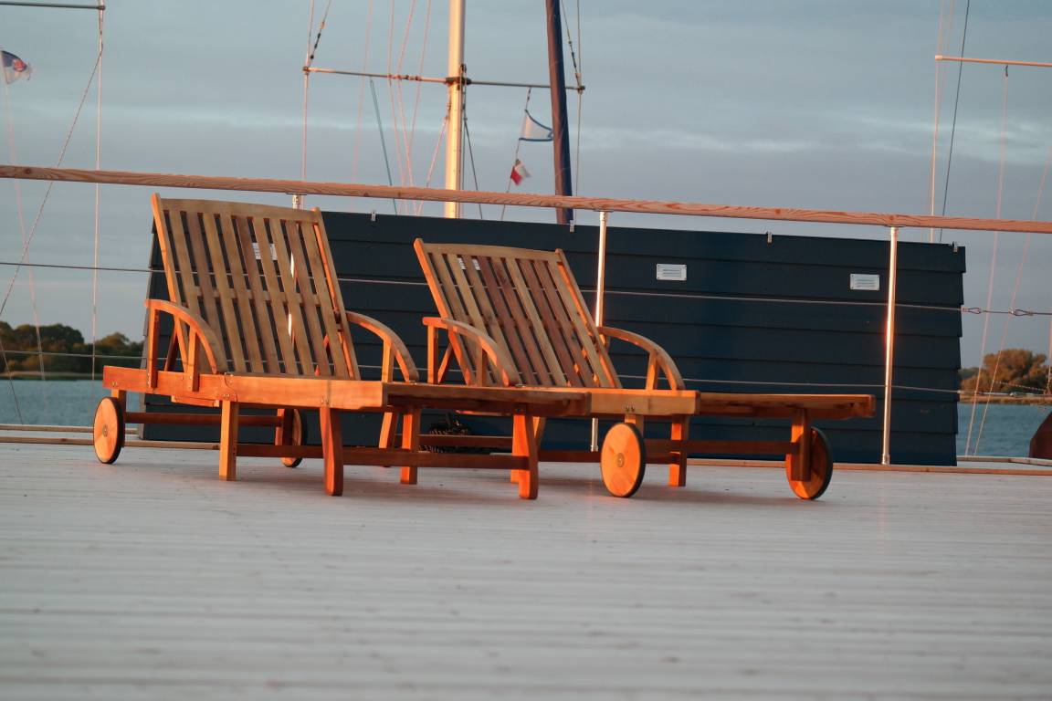 Das gesamte Oberdeck kann im vollen Umfang genutzt werden. Hier steht ein eigener Strandkorb, Palettenmöbel und Liegestühle zum Relaxen zur Verfügung.