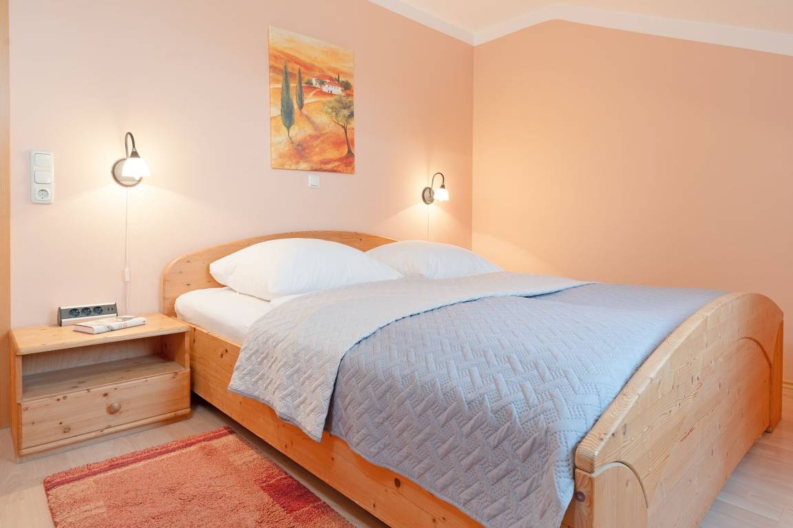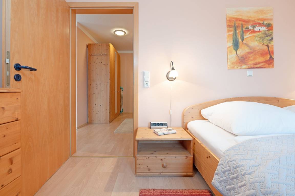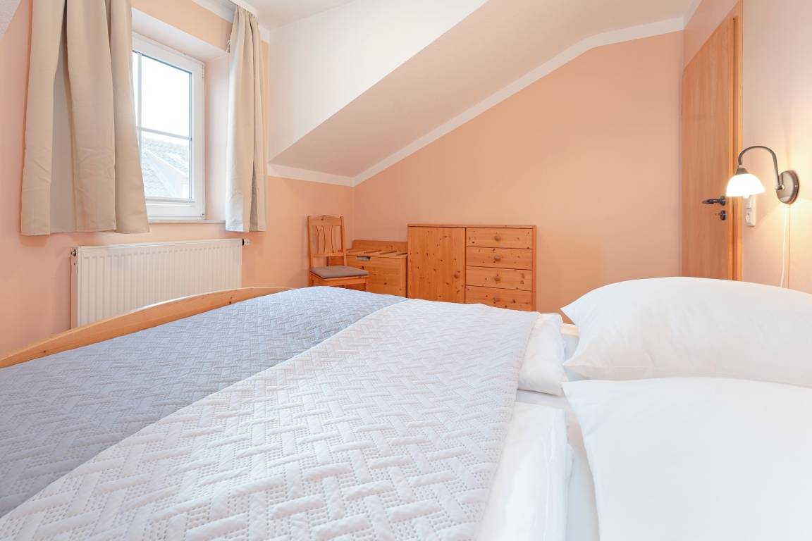 Schlafzimmer: 1 Doppelbett (2x 90x200 cm), Kommode/Truhe, Verdunkelung: Gardinen und Plissee